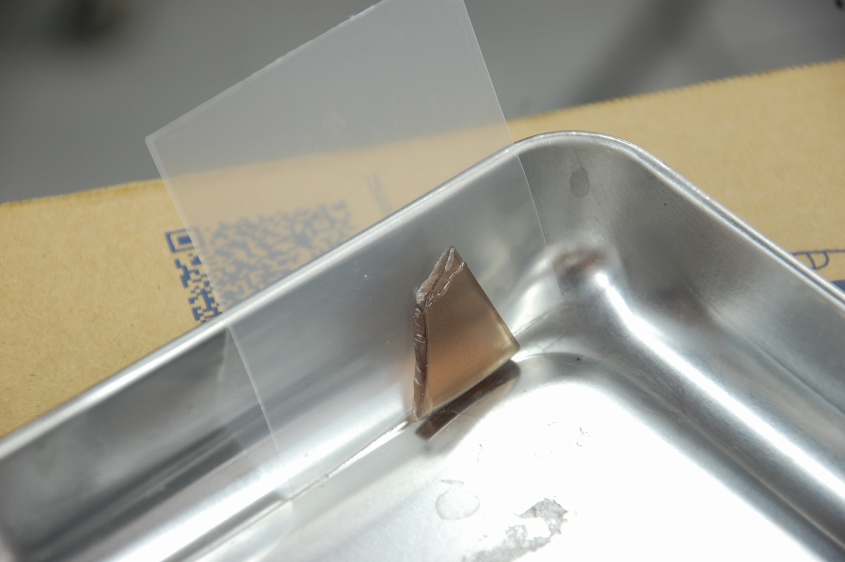 掛けたレンズは2つで、まずはそれぞれを接着します。位置がズレないようPP=ポリプロピレン製の板を添えておきます。