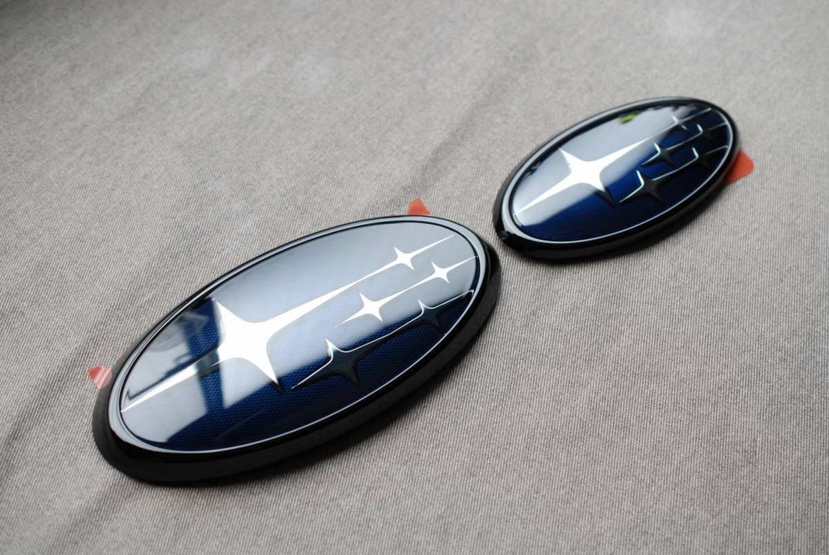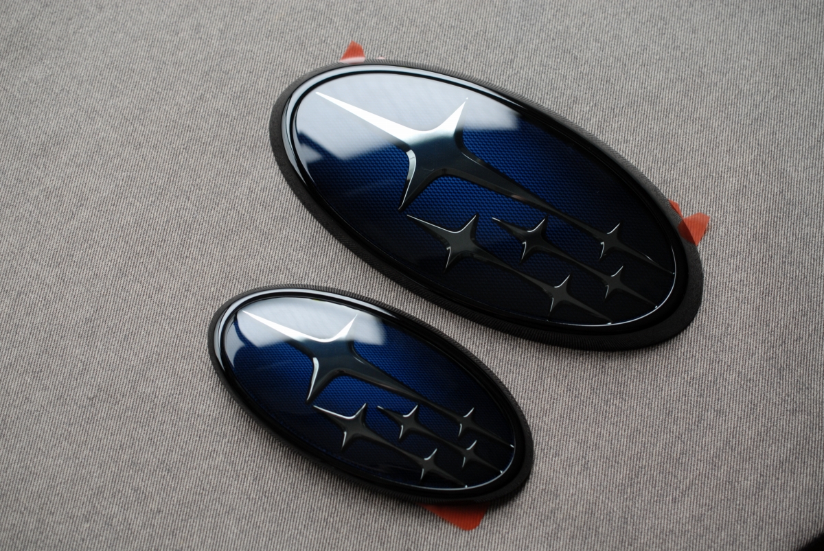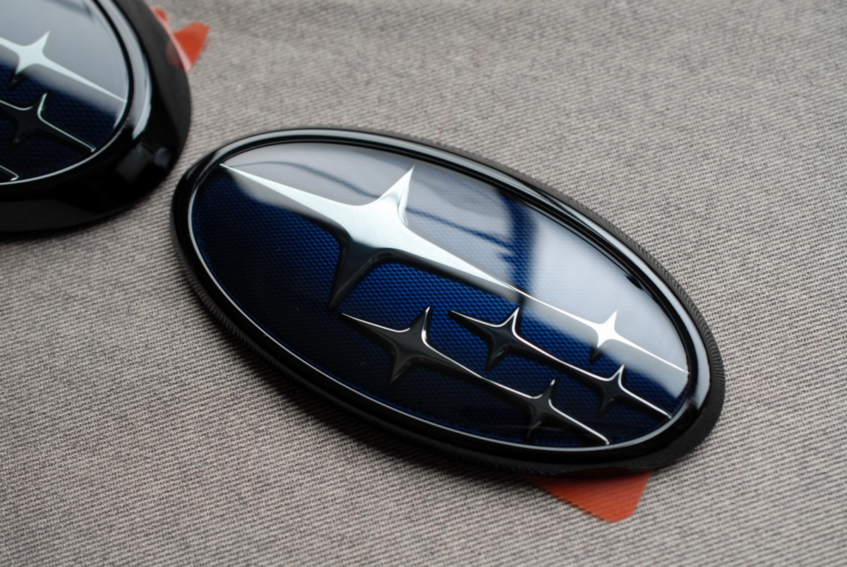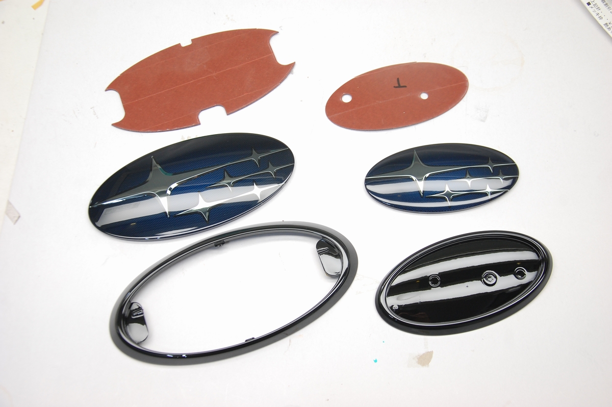 先日本塗りを終えていたスバルSKフォレスター用の純正エンブレムのメッキ枠とアクリルプレートです。