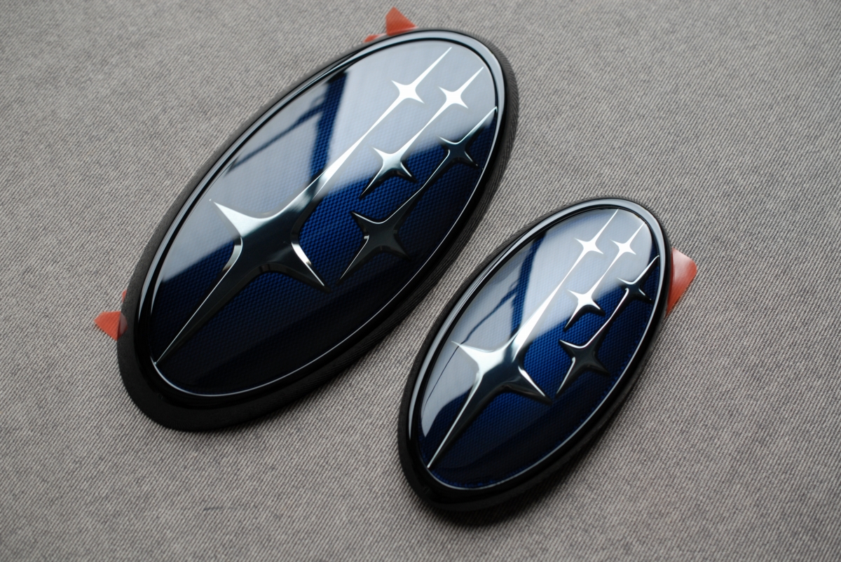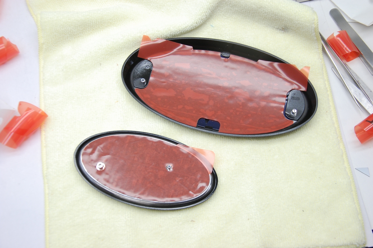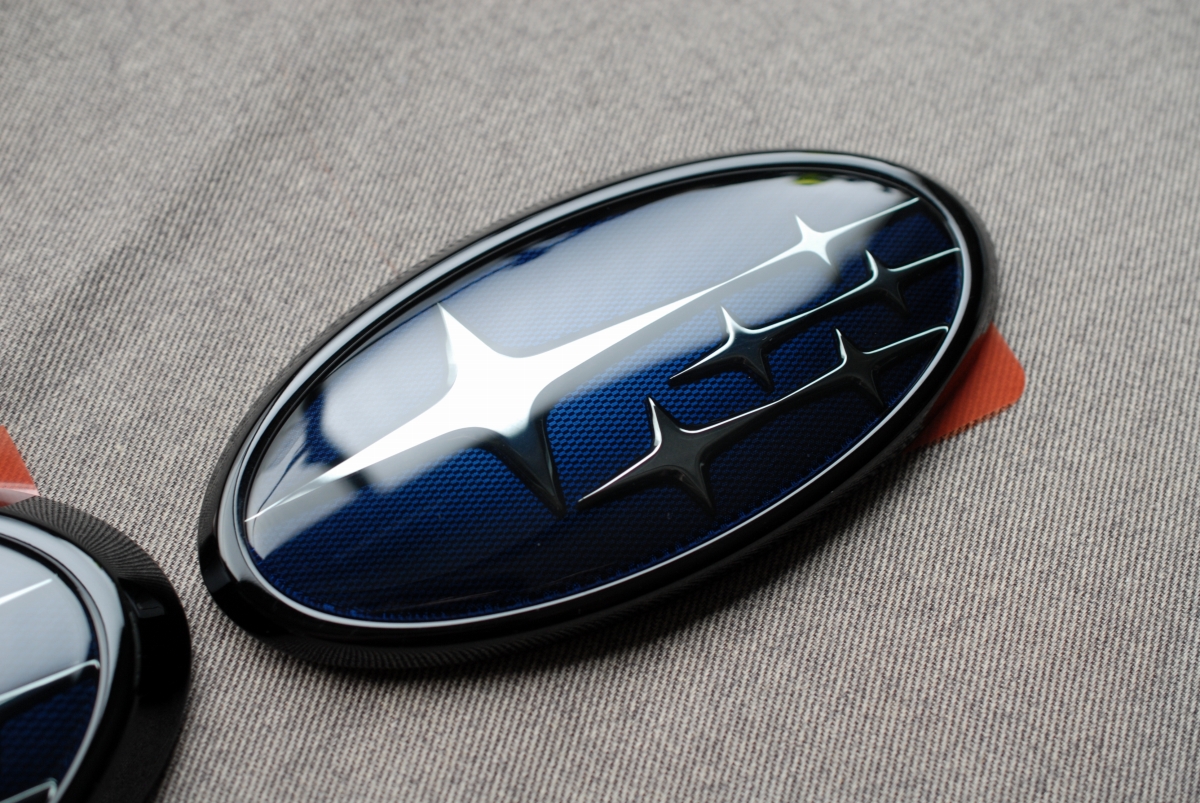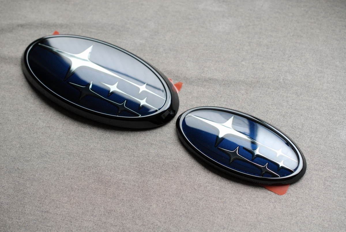 先日本塗りを終えていたスバルSKフォレスター用の純正エンブレムのメッキ枠とアクリルプレートです。