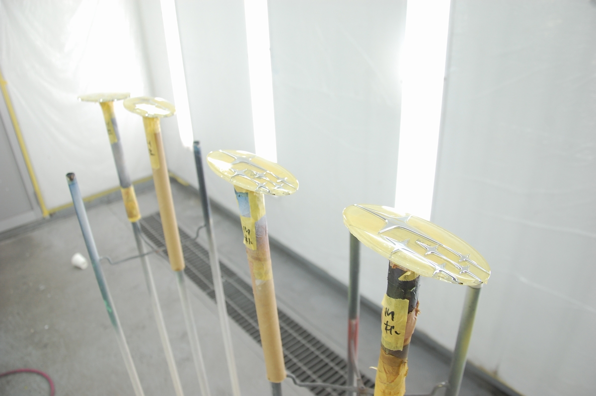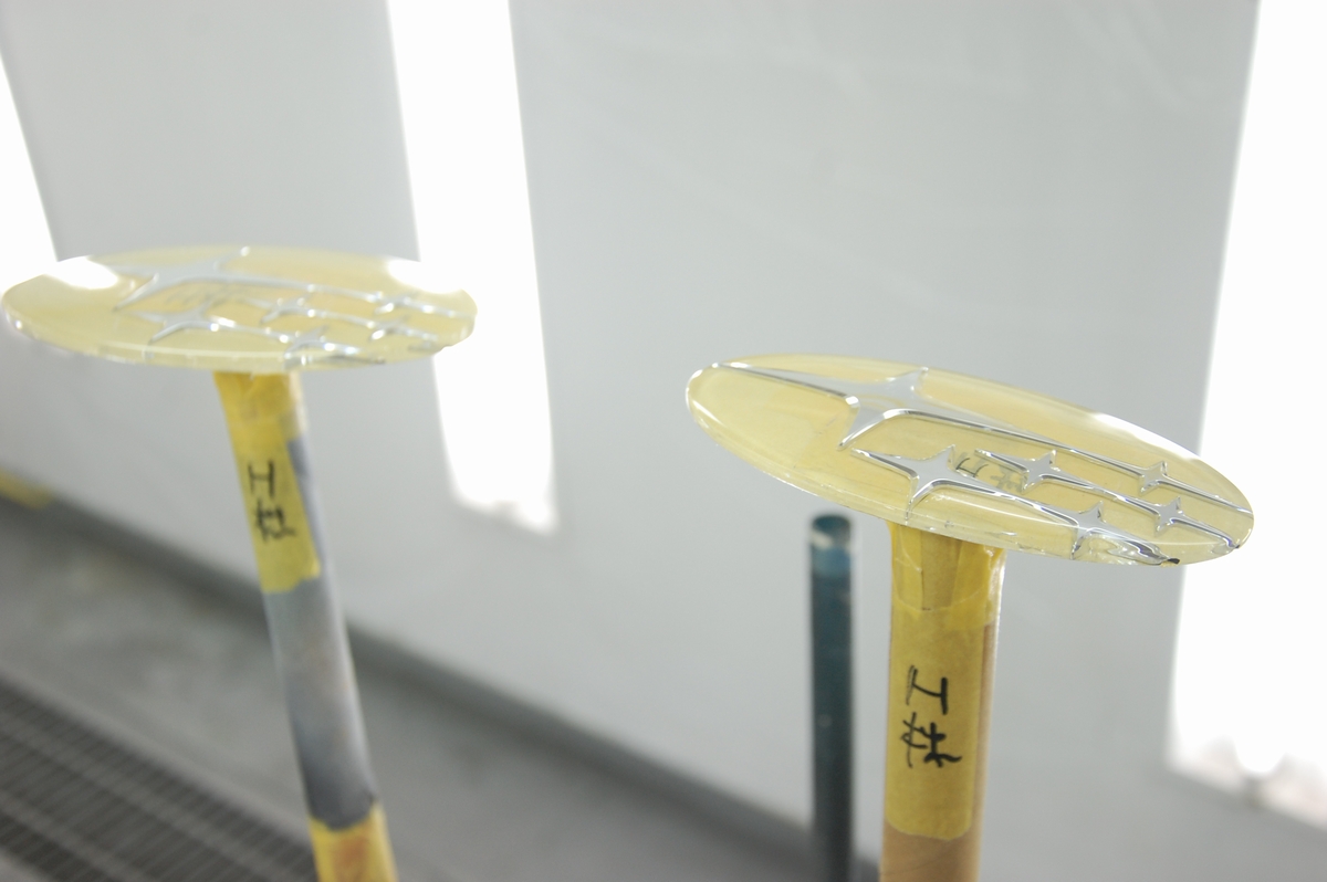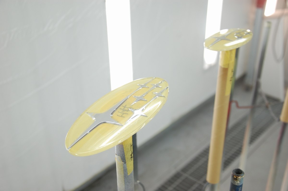 先日の下準備でクリアーの下塗りを行ったスバルエンブレム(93033AG043)です。こちらは裏表共にクリアー塗装が終わったので、恒温器(乾燥炉)の中で保管しつつ2度焼き~三度焼きを行っておきます。