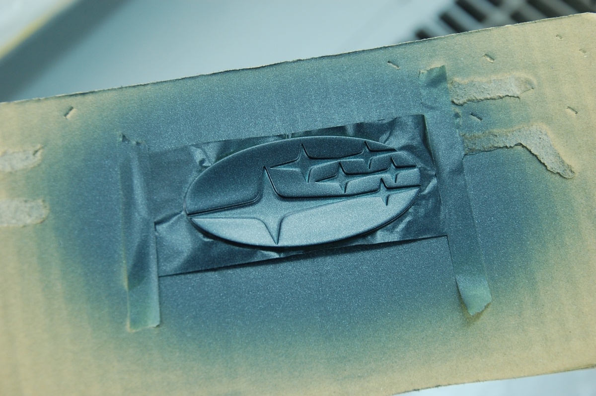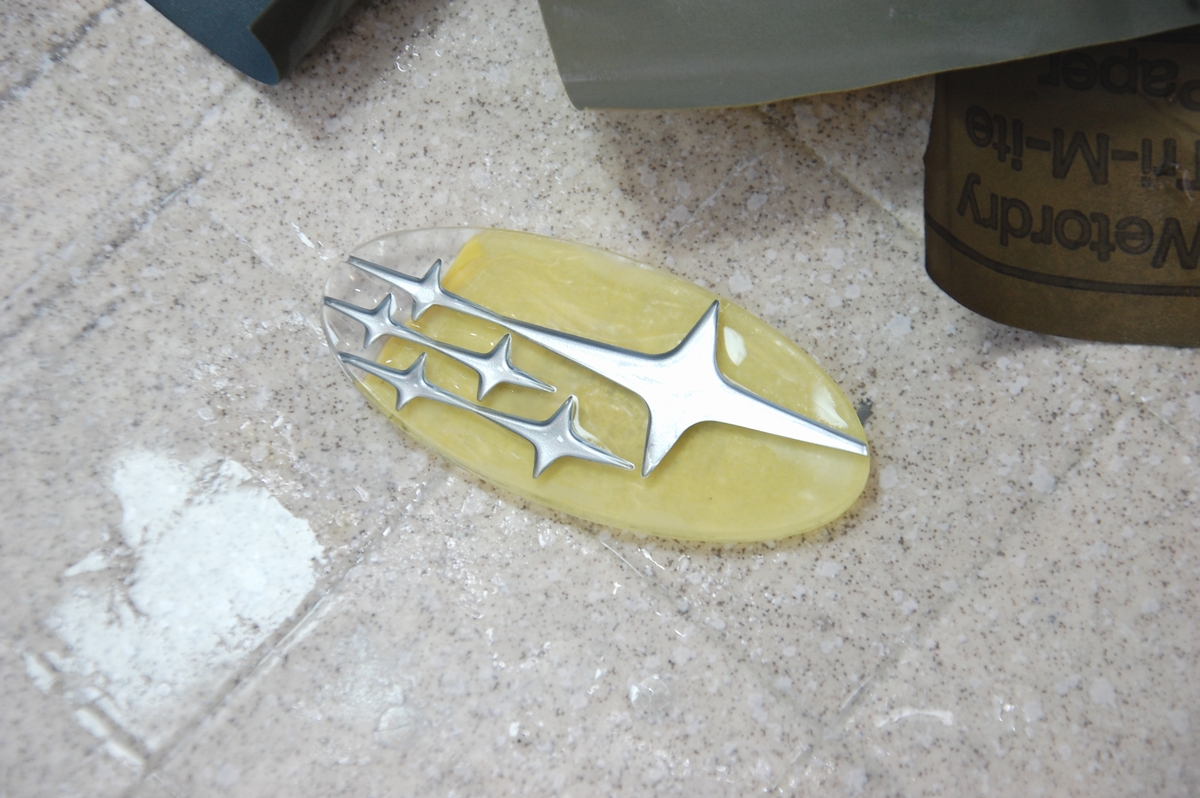 先日下準備を行っておいた小さいサイズのスバル純正エンブレムアクリルプレートです。背面の青い被膜と六連星のメッキを剥がし、裏と表の両面にクリアーで下塗りを行っています。