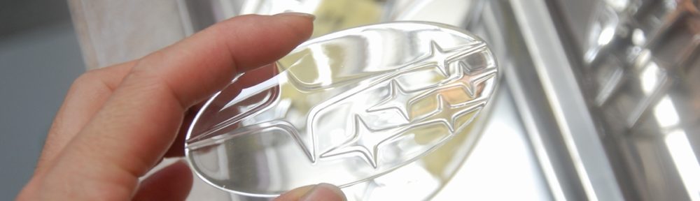 先日下準備を行っておいた小さいサイズのスバル純正エンブレムアクリルプレートです。背面の青い被膜と六連星のメッキを剥がし、裏と表の両面にクリアーで下塗りを行っています。