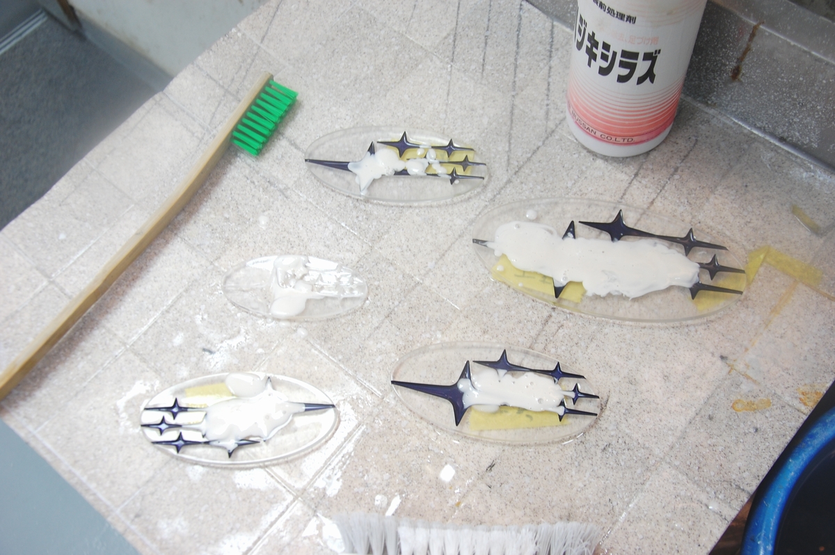まずは裏側を塗るので、ナイロンブラシとウォッシュコンパウンドを使って足付け処理を行います。並行して作業している他のエンブレムも一緒に行っておきます。一緒に行っているのは先日紹介した、背面をキャンディレッドにしたエンブレム2セットですね。