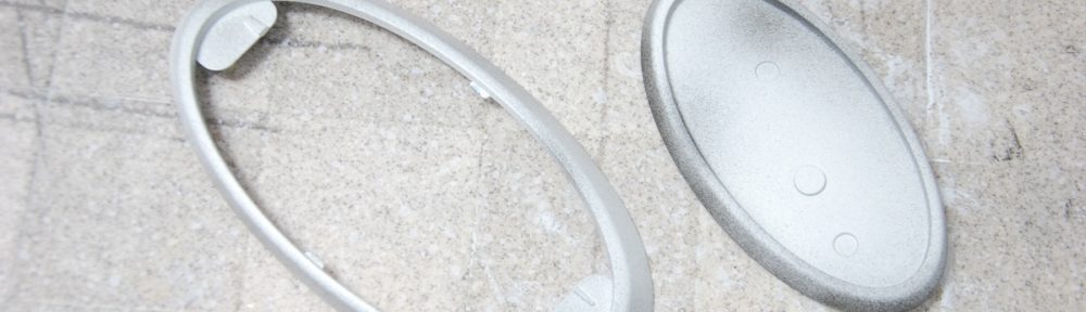 少し前に下準備を行っていたスバルエンブレムのメッキ枠です。その後60℃40分程の熱を何度か掛けて塗膜を硬化させ、ガイドコートとしてベースコートの黒をパラパラと塗っておきました。