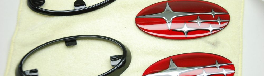 先日アクリルプレートの本塗りを終えていたスバル純正エンブレムです。その後60℃40分程の熱を掛けて塗膜を硬化させ、予め作成しておいた両面テープを貼ってそれぞれのパーツを組付けます。