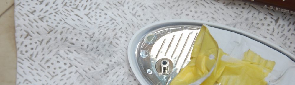 下塗りのクリアーを塗っておいたアクリルプレートも熱を入れて硬化させておいたので研ぎ作業を行います。レベリングする塗料(クリアー)は表面張力でフチに溜まる傾向がある為、そこを平滑にするように#1500で水研ぎ、全体も研磨して足付け処理を行っておきます。