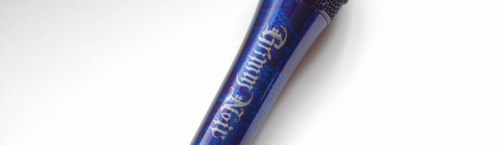 マイク本体はブルーメタリックパールと紫パールの2色をレース生地を使った塗り分けの塗装を行っています。