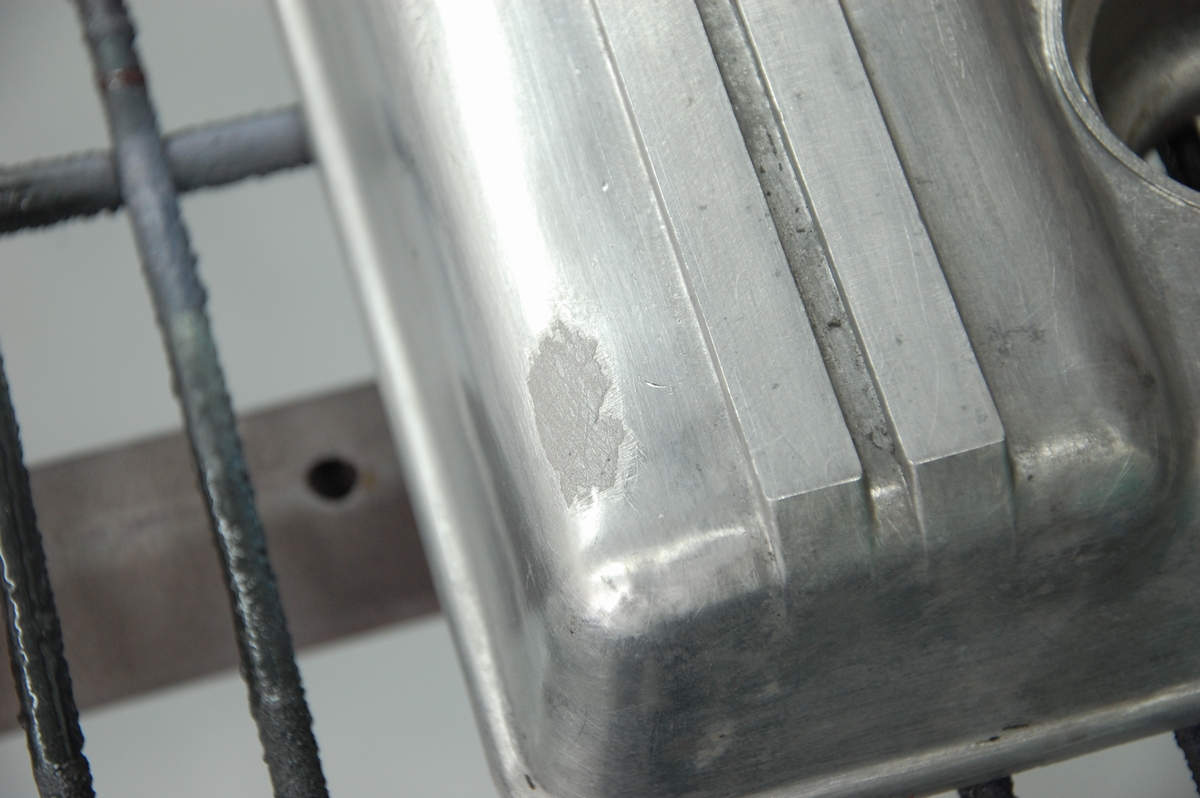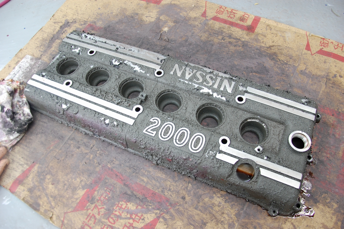 2カ月程溶剤槽に浸けておいたヘッドカバーです。溶剤槽は元々廃棄するシンナーを溜めて再利用した物ですが、剥離剤程の威力が無いのでここまでの期間浸けておいても完全には剥離されません。