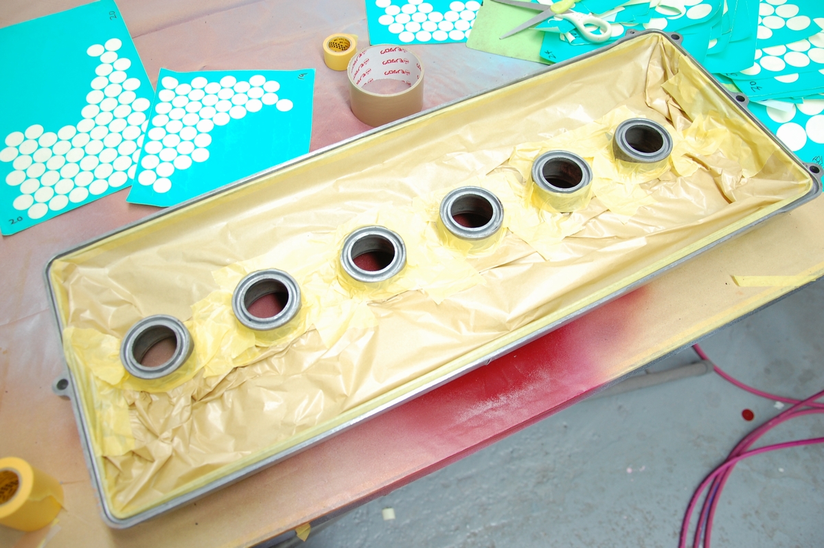 今回は裏側のバッフルプレートが着いたままなので、その中に砂が入らないようマスキングを行っておきます。