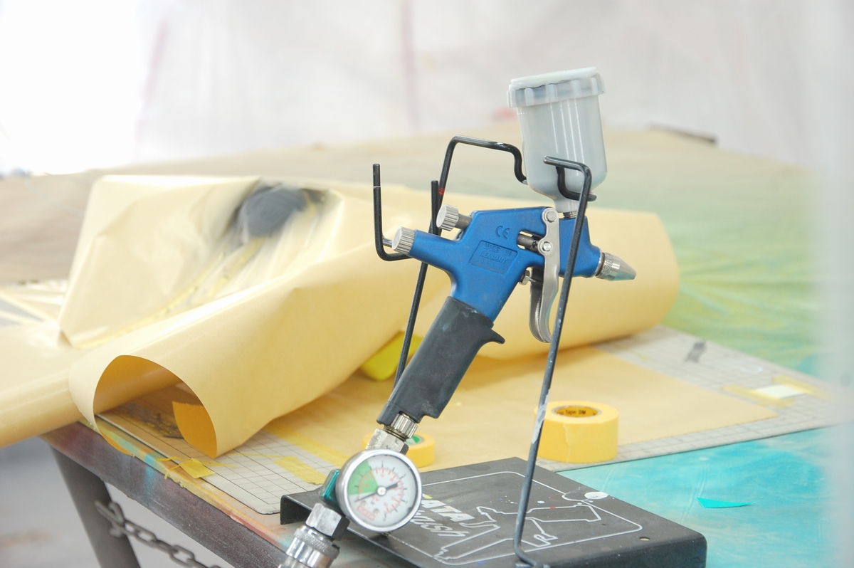 続けてご指定の塗色=鮮やかなイエローを塗布します。鮮やかな原色は隠蔽力が非常に弱く、それを黒の上に塗っても延々下色が透けてしまいますから、一旦明度と隠蔽力の高い下色を塗って無用に塗膜厚が大きくなるのを防ぎます(ベースコートの厚塗りは塗膜の強度が落ちる為)。