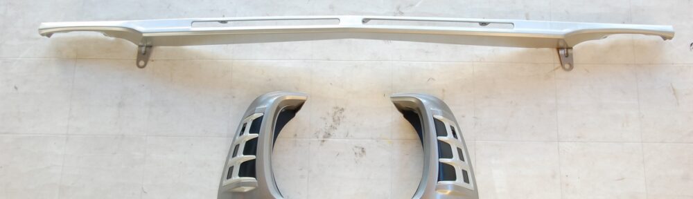 こちらのパネルも恐らくクリアーは塗っていないですが、今回は耐久性(耐候性)も考慮して、シルバー+ブラック塗装後に全体に半艶使用のクリアーコートで承っています。新車時はマスク型を使っているので塗り分けは比較的簡単に出来ていますが、これをマスキングテープで塗り分けをするとなるとかなり難しいですね。黒い部分を二回に分けるかも知れません。尚こちらのシルバーは「現状と似た感じ」と言う事で、厳密な調色作業は行わず、色見本等から似たような色を見つけて採用しようと思います(または一から作ってしまうかも知れません)。