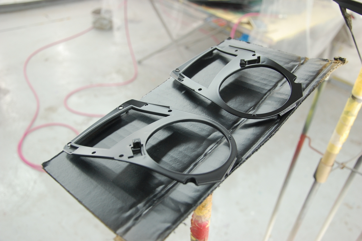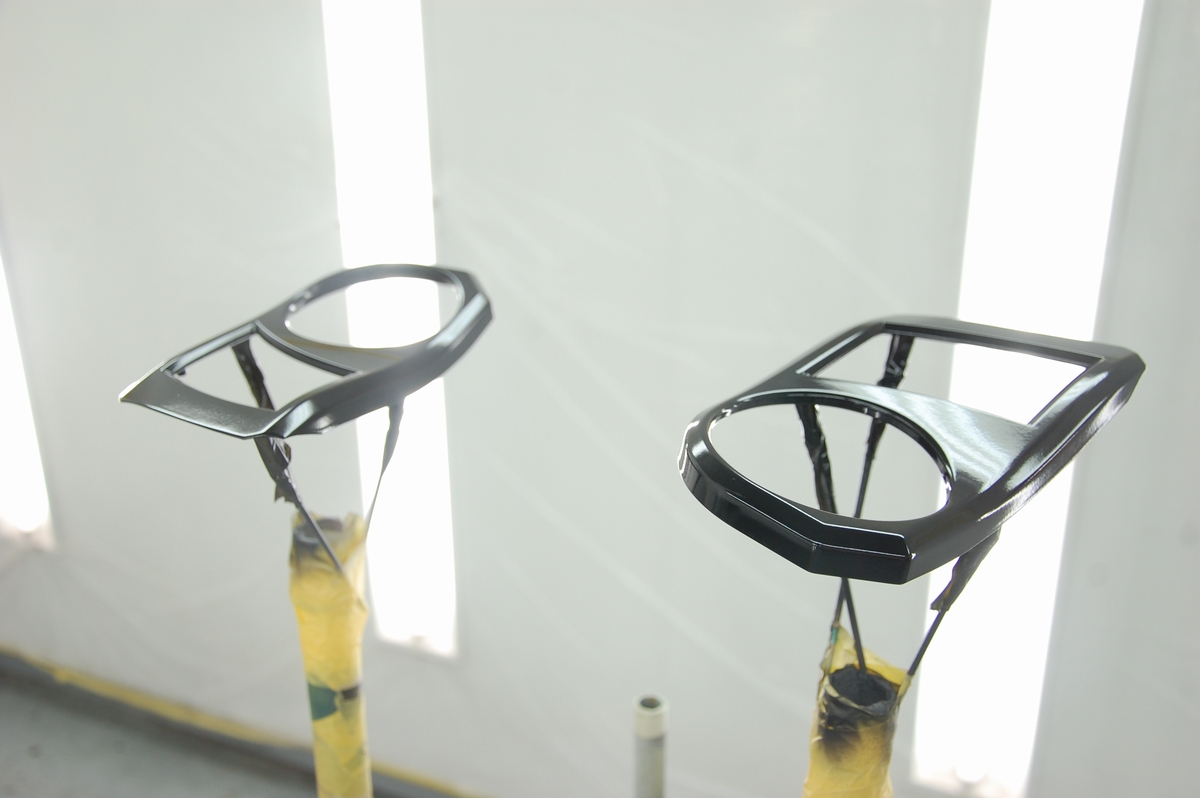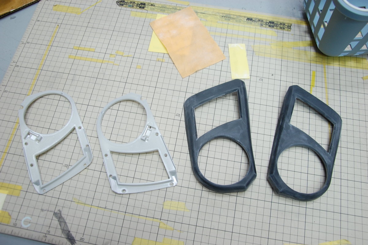 先日下塗りを行っておいたドリンクホルダーの蓋パーツ4点です。その後60℃40分程の熱を掛けて塗膜を硬化させておきました。画像は研ぎ作業を初めてから撮影し忘れていたのに気づいた状態です。