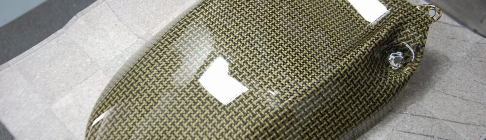 先日一回目のクリアー下塗りを行っておいたバイク用のカーボンケブラーリアフェンダーです。今回は常温で硬化するタイプのSTANDOX VOCエクストリームプラスクリアーを使っていますが、保管している間は恒温器に入れておいたので、他の御依頼品と一緒に60℃40分程の熱を掛けておきました。
