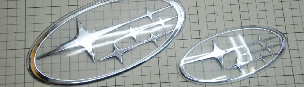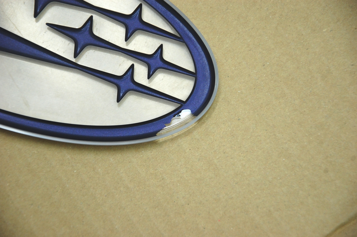 先日より検証~下準備を行っていた新型フォレスターの前後エンブレムです。通常スバルのエンブレムはメッキの枠とアクリルプレートが別々になっていますが、こちらはアクリル樹脂の中に全てを封入した一体型のタイプとなります。今回は背面を既存の青からターコイズブルーに変更で承っていますので、いつものアクリルプレートと同じく裏側から背面の青い被膜を削り落としています。