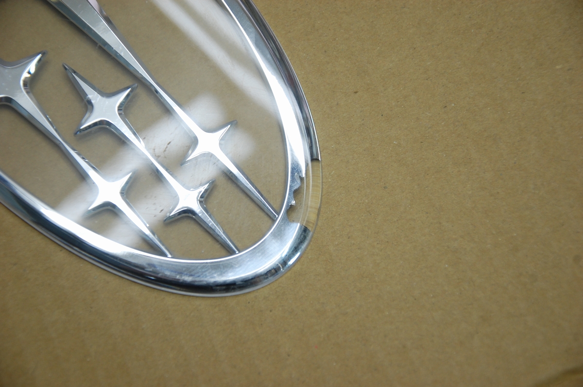これまでのスバルエンブレムであれば脱脂用溶剤(シリコンオフ)でジャブジャブ濡らしても全く問題無いですが、どうやらアクリル樹脂とメッキ層でしっかり密着していないようです。新しいタイプのエンブレムなのでこういった問題点はメーカー側も把握していないと思いますから、この新型エンブレムを採用している全車でこのメッキが浮いてしまうなんて事が起きなければ良いのですが・・・。