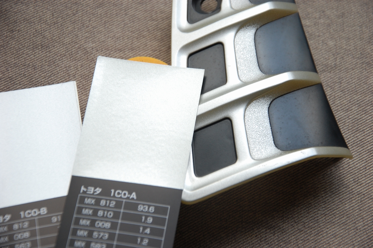 サイドガーニッシュとフロントグリルモールはトヨタ「グレーメタリック」(カラーコード:1G3)を想定していたので、まずは作業前(サフェーサーで塗装する前)に色を確認しておく事にしました。