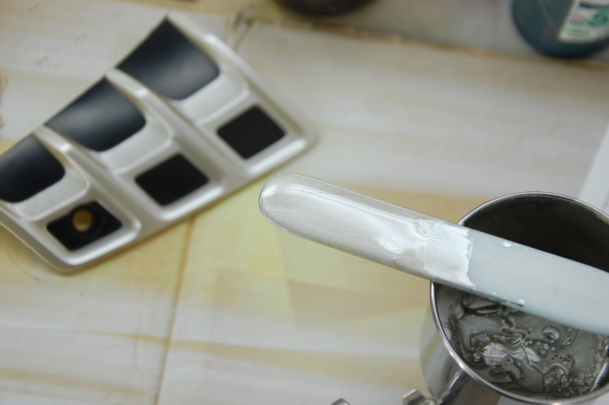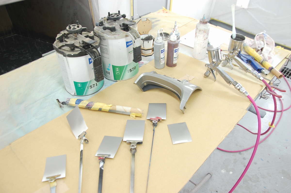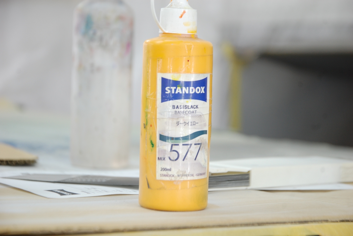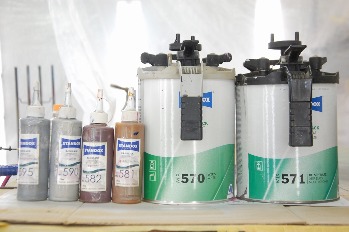 使ったのはこちらで、一番左がSTANDOX原色で最も粒子が細かい極細目メタリックMIX595で、隣が中目メタリックのMIX590、赤味の茶MIX582、緑味の茶(赤味の黄)MIX581、白のMIX570、黒のMIX571です。前回のように測色機を使っても良かったのですが、慣れているこっちの方が早いんですよね。