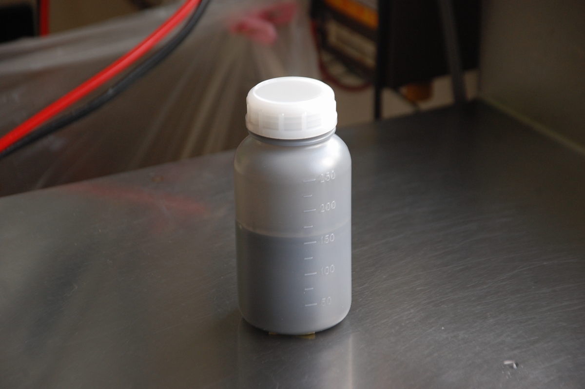 サイドガーニッシュとフロントグリルモールに使うグレーメタリックは、オーナー様の方で別途塗られたい部品があるとの事で、小分けした物をご購入を頂いております。その分多めに作っておきましたので間違って使わないよう容器に入れておきます。