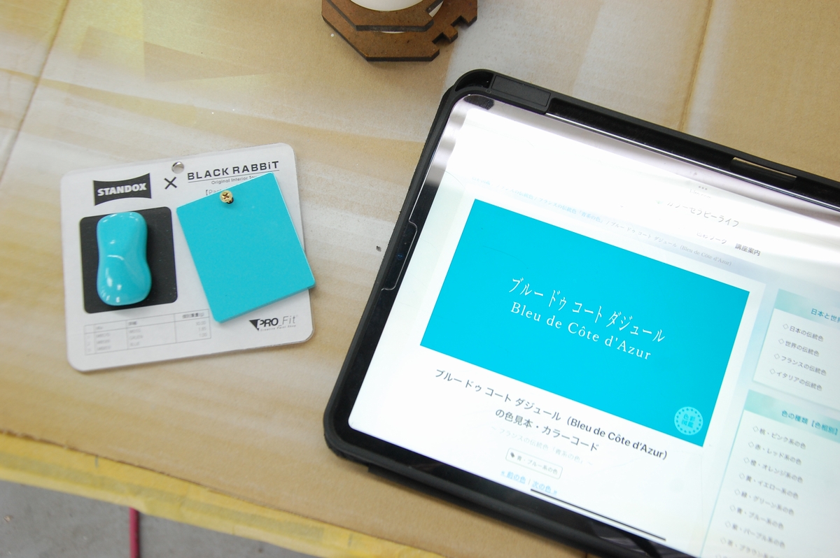 似たような色として、以前知り合いの塗装屋さんからご依頼頂いた色と見比べてみると、今回の方が大分青味が強いです。