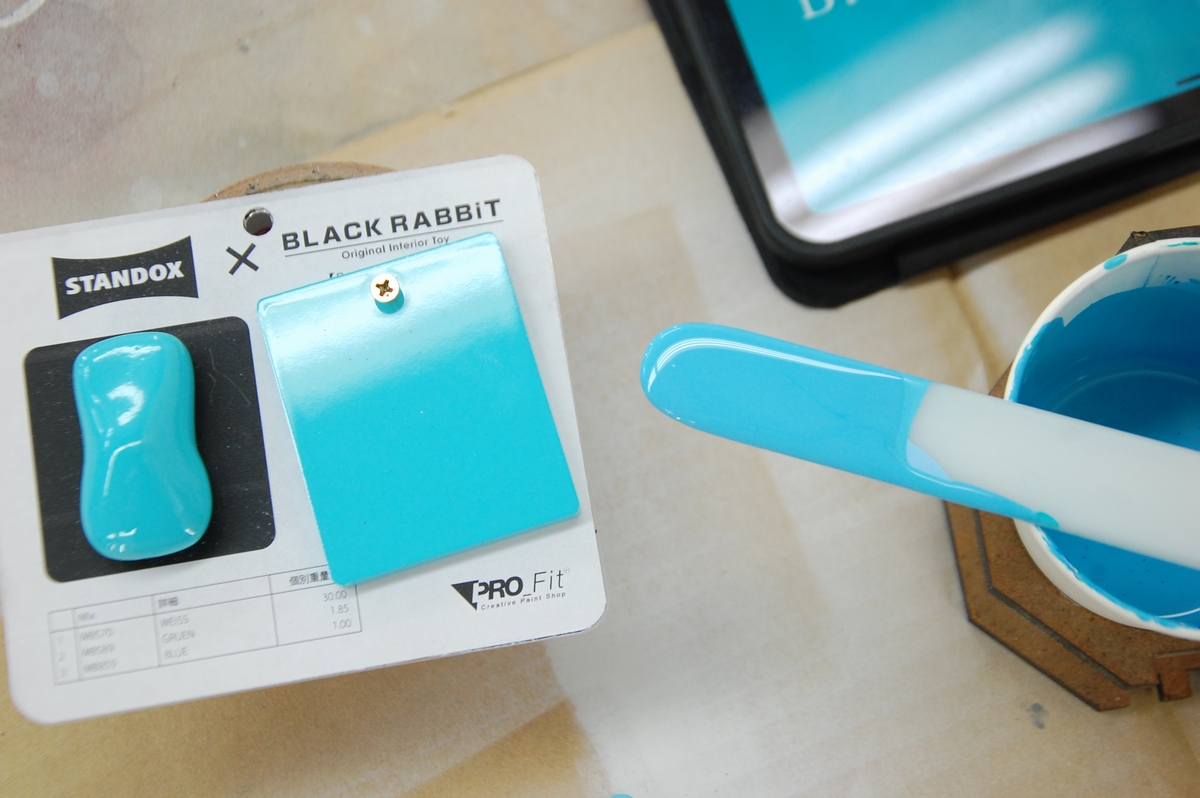 今回は上段のレターマークと、下段スバルエンブレムの背面をターコイズブルーで承っていますので、まずは色を作製します。