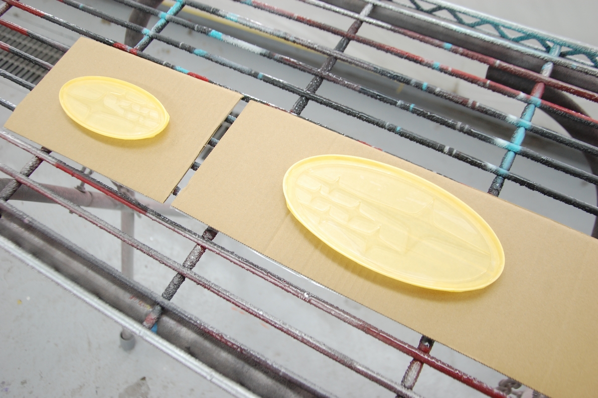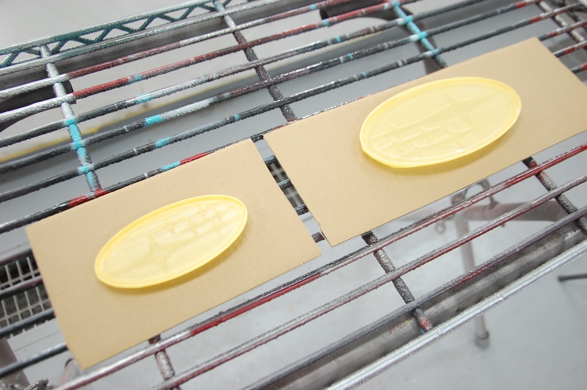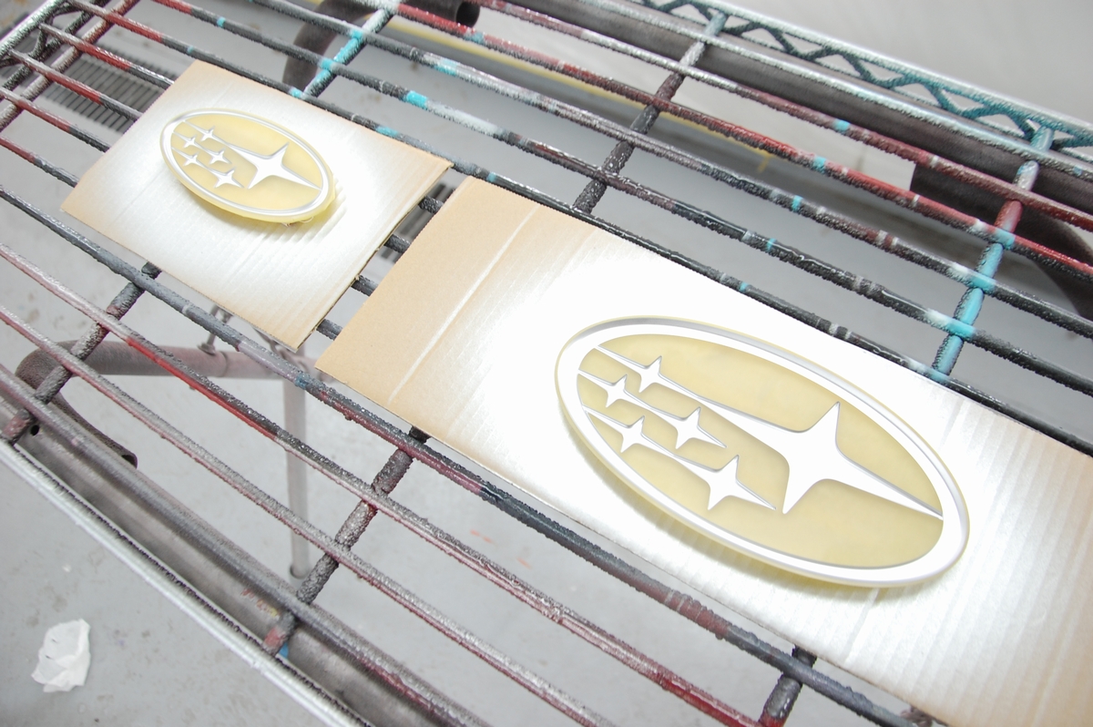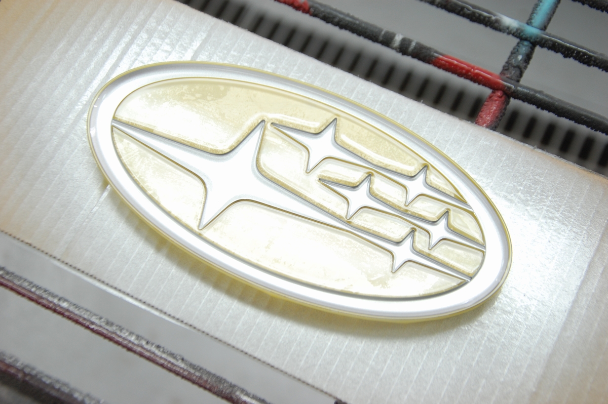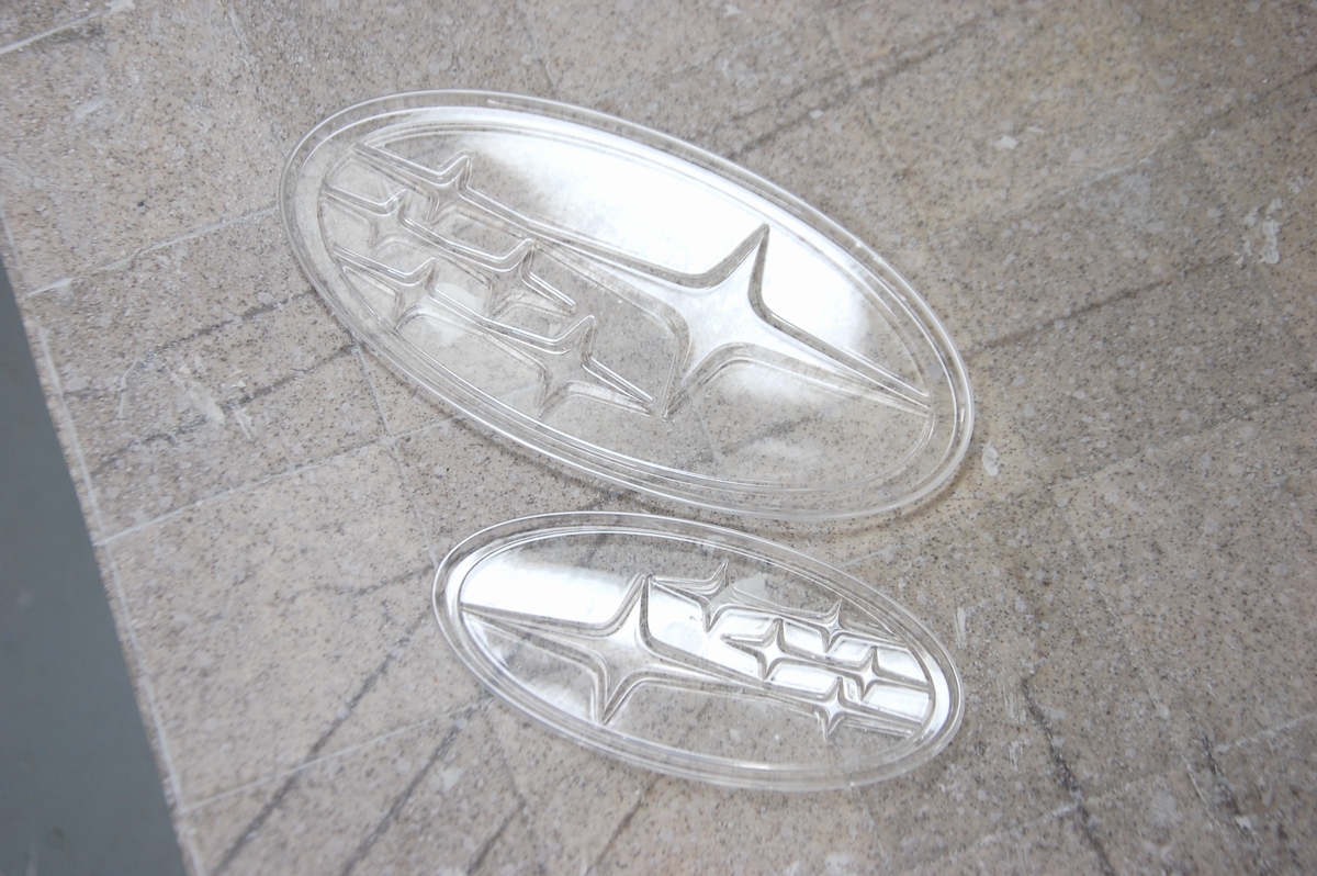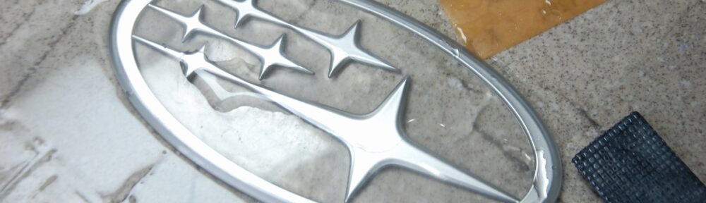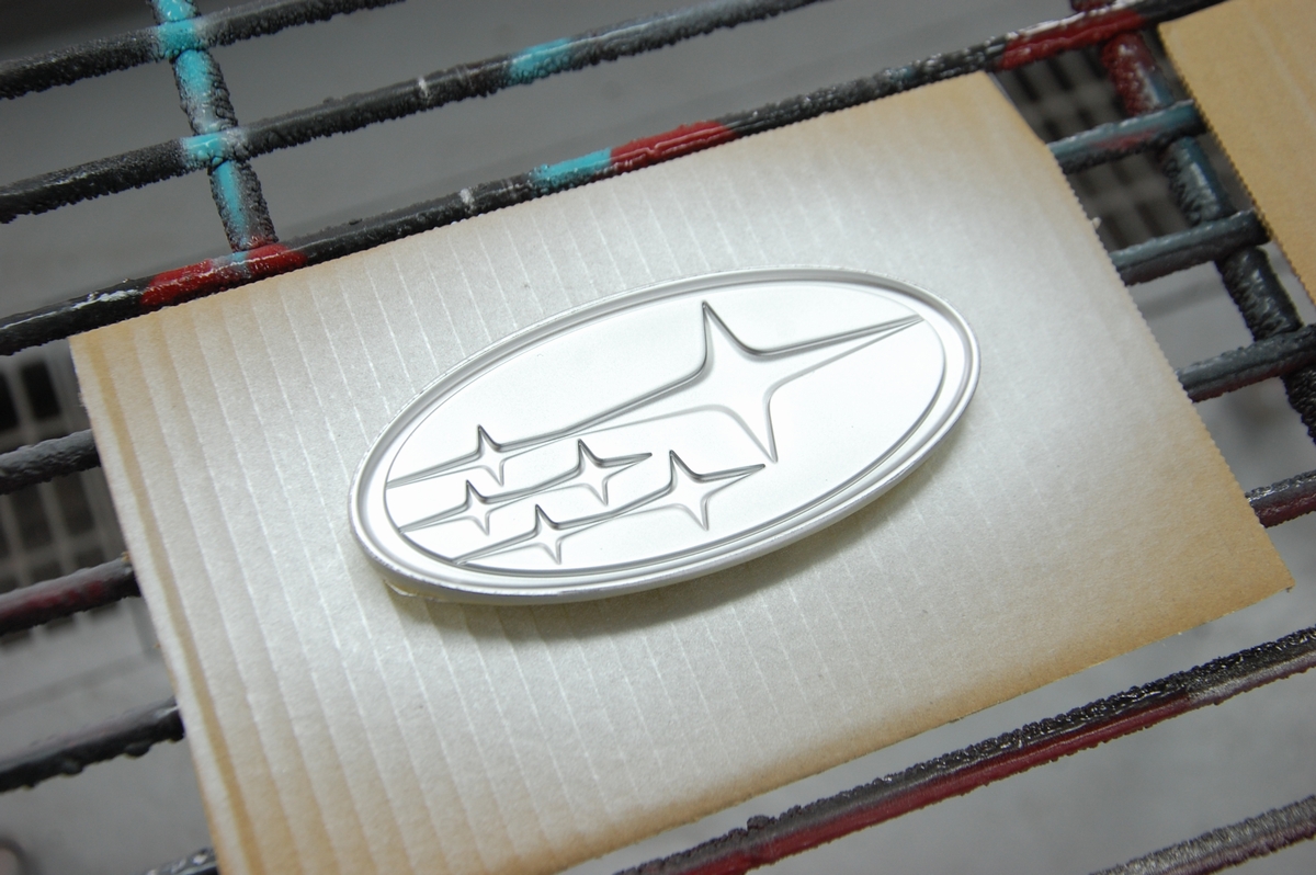 先日背面に使うターコイズブルーの色を作成しておいたスバル新型フォレスターの枠一体型エンブレムです。既存の被膜とメッキを剥がし、クリアーで下塗りを行っています。