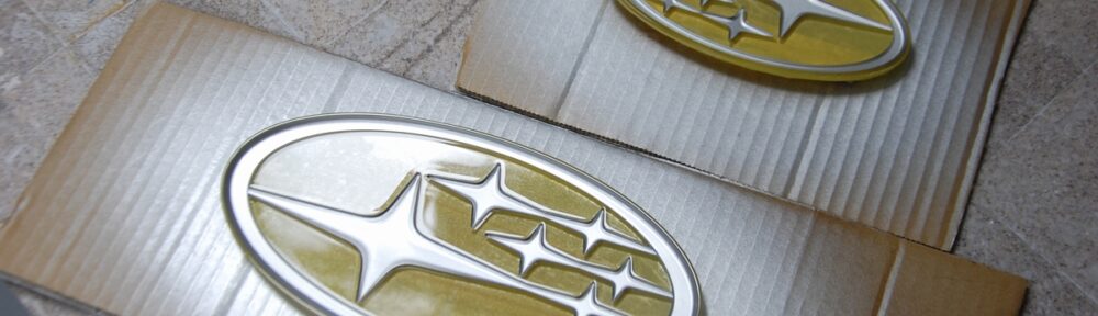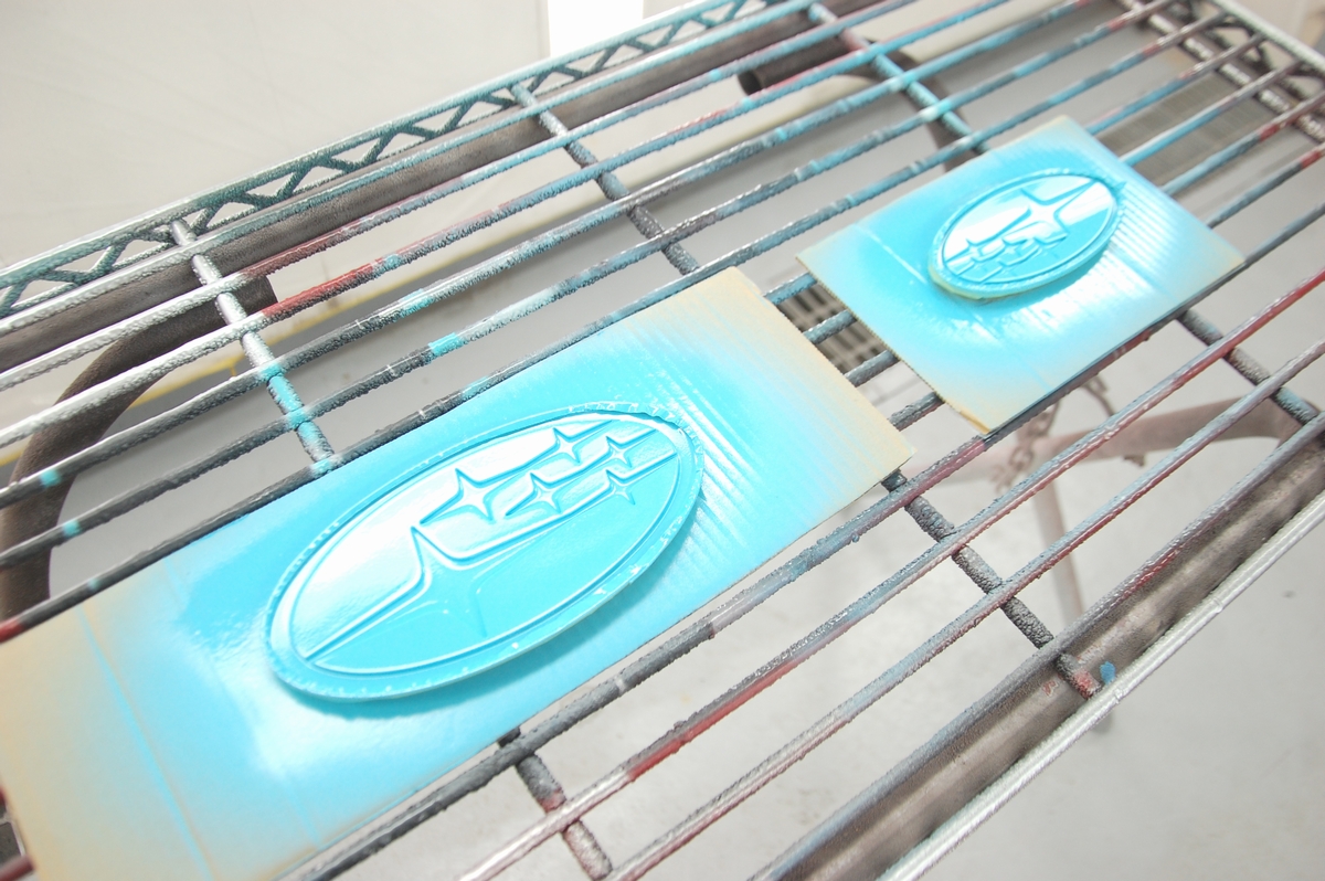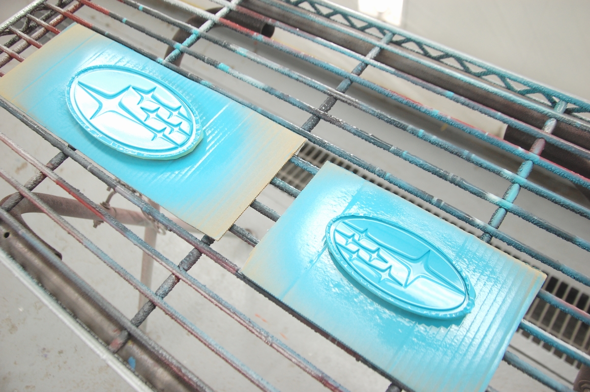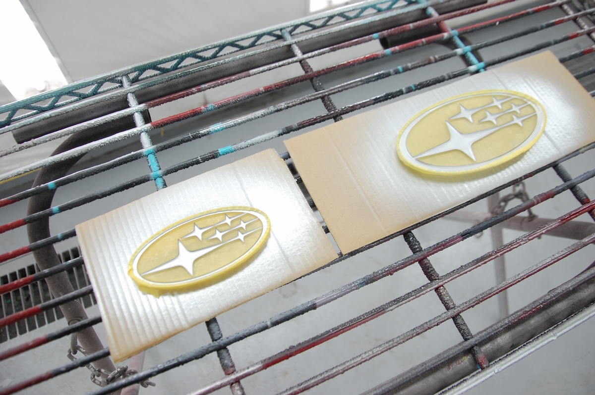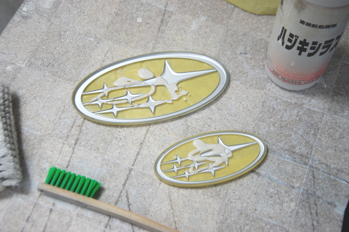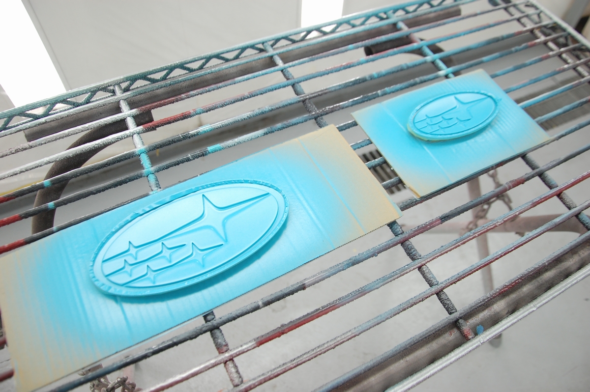 先日シルバーを塗っておいたスバル新型フォレスターの枠一体型エンブレムです。その後60℃40分程の熱を掛けて塗膜を硬化させておきました。