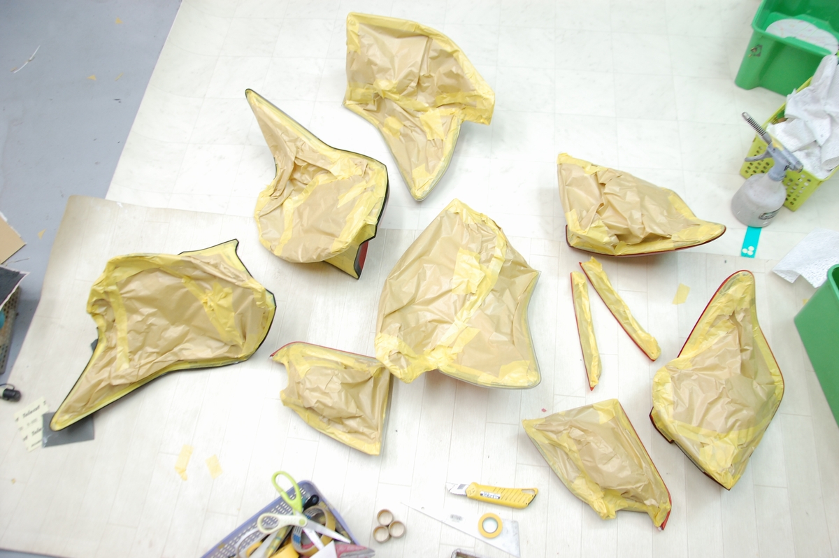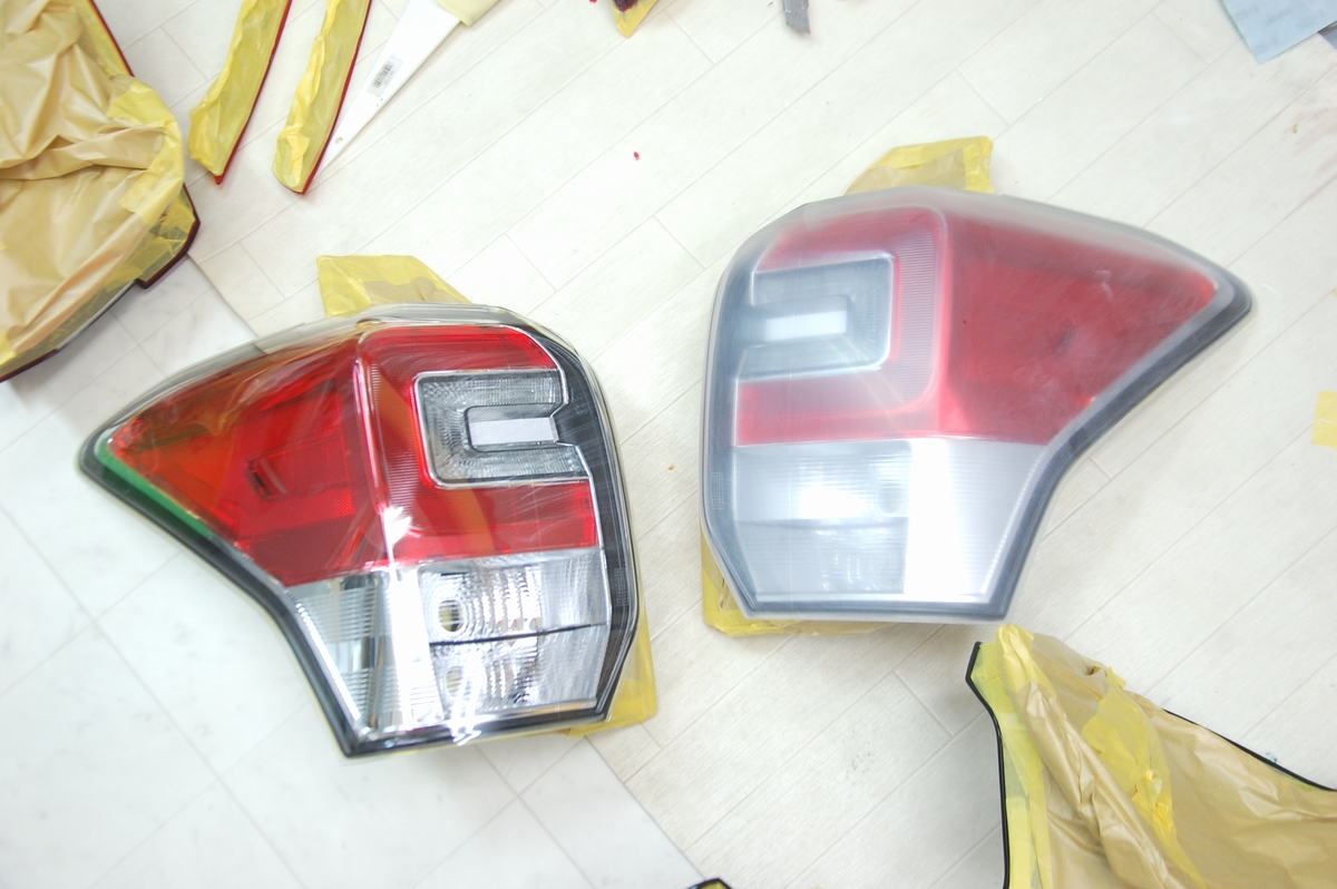 先日に引き続き、次の透過性塗装のターンで本塗り予定のテールランプ等レンズパーツです。テールランプは裏側のマスキングを行いました。