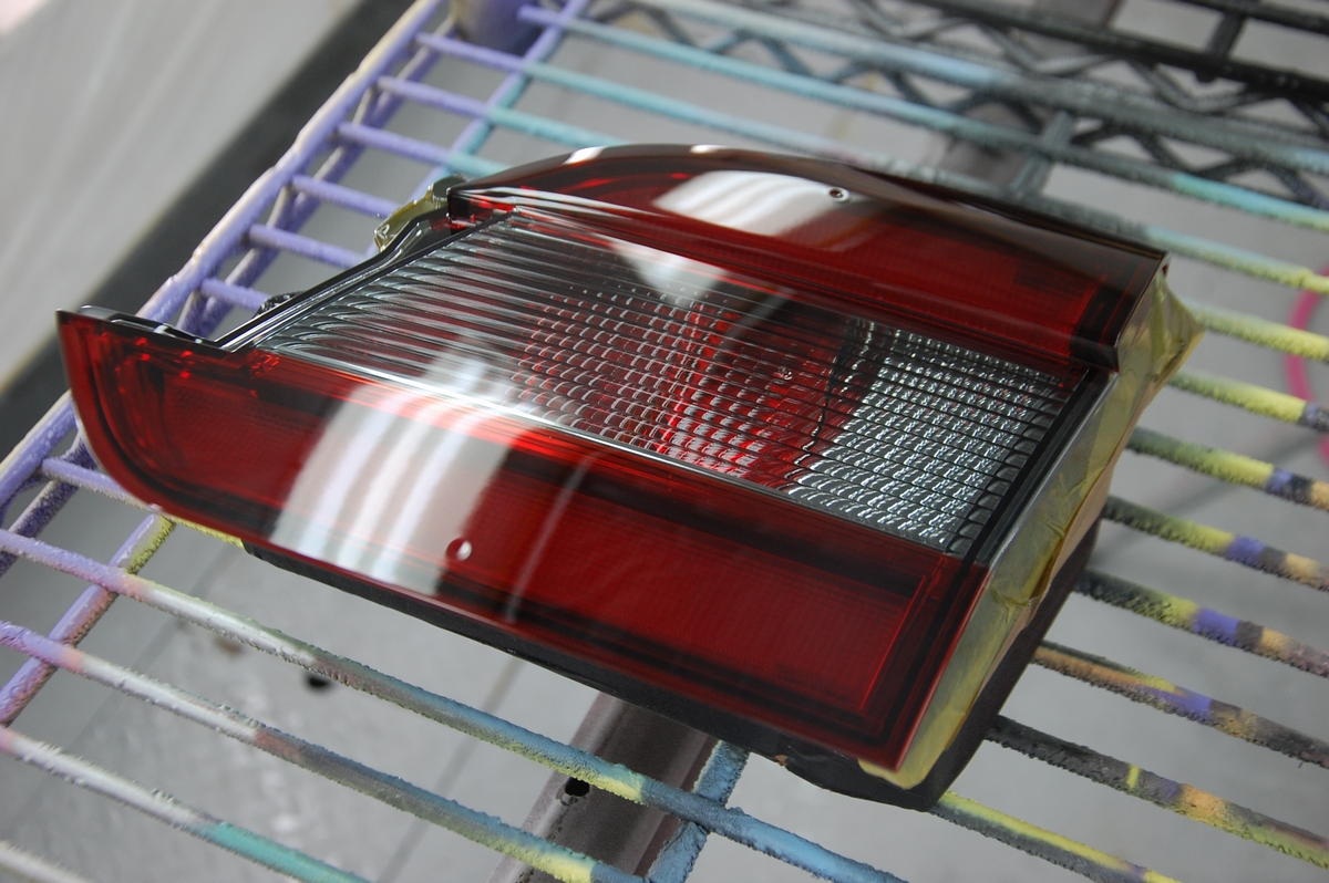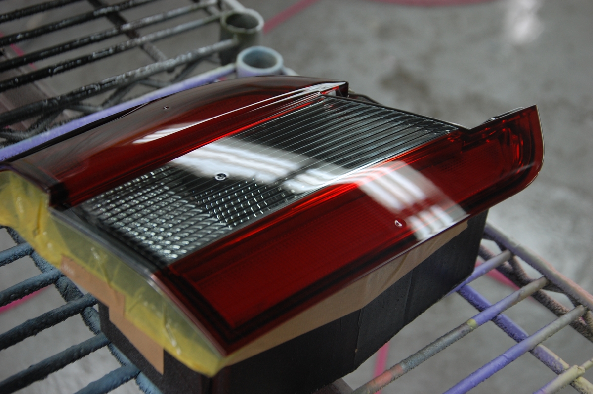 本塗り前には高圧洗浄機を使って被塗物(テールランプ)を置く台や棚板などに残った毛埃などをしっかり洗い流しておきます。