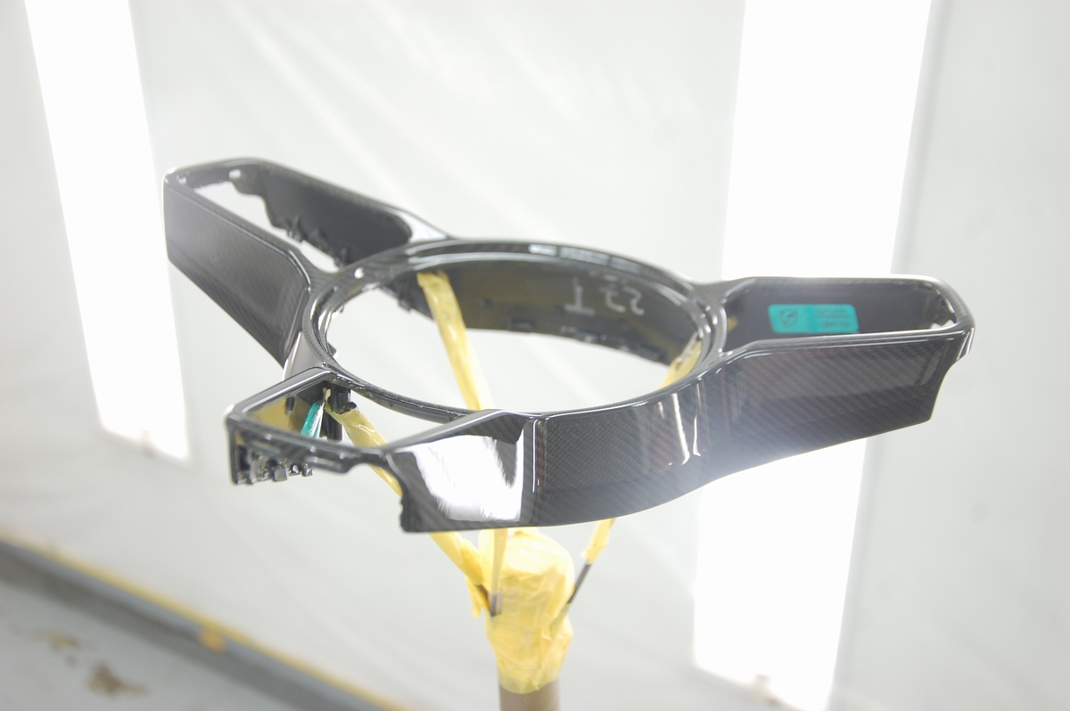 本来なら膜厚が充填出来る体質顔料(タルク等)を含んだスプレーパテやサーフェサーを使うべきところですが、今回のようにカーボン地を活かす場合はクリアーを使うので「塗装→研ぎ」を何度かに分けて行います。「一回で6コートくらい塗ればよいんじゃ?」と思うかも知れませんが、一度に大量の膜厚をつけるとトラブルの原因になる為、数回に別けて行う必要があります。