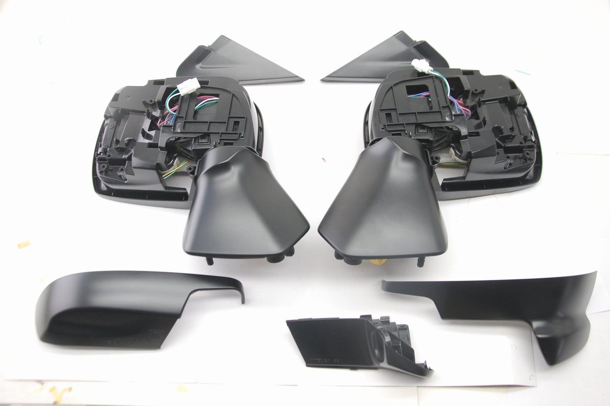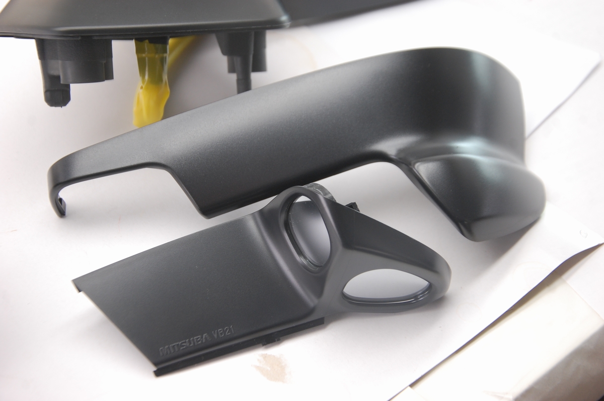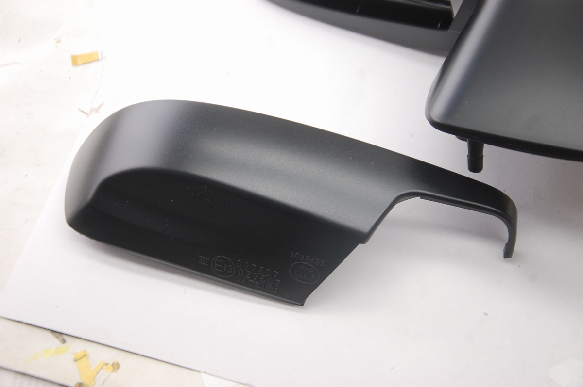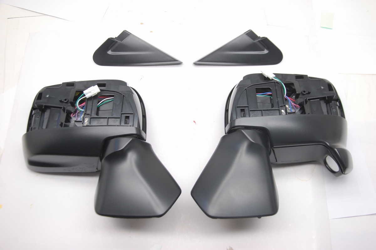 色としては、こちらのミラー本体と土台が「半艶黒」で、これについてはこれまでご依頼頂いた時と同じく「STANDOX K9140とK9150を1:1で混合、ハードナー 27%、シンナー18%」)を想定しています。記録を残しておくと後からのご依頼でも同じ質感(色艶)に出来るのが良いですね。