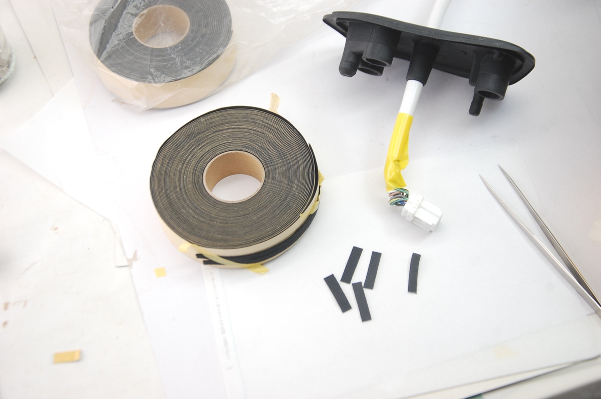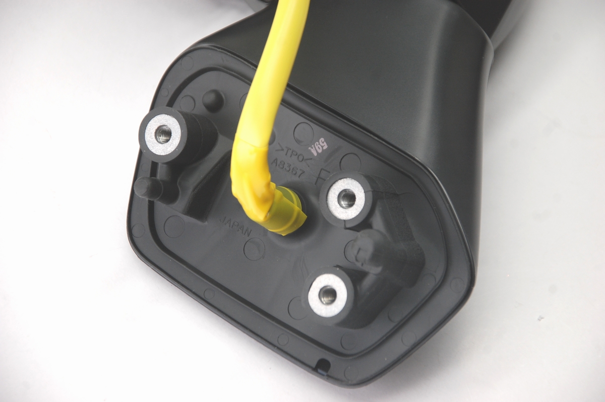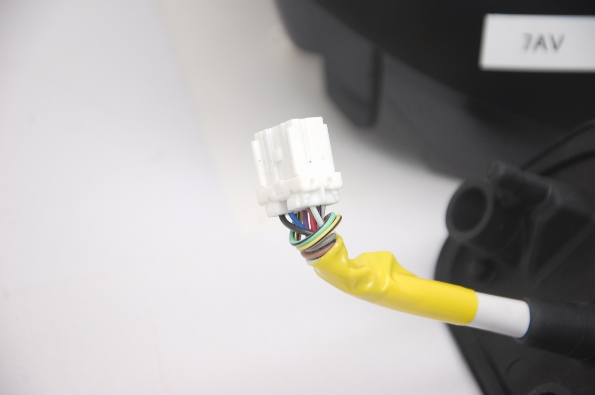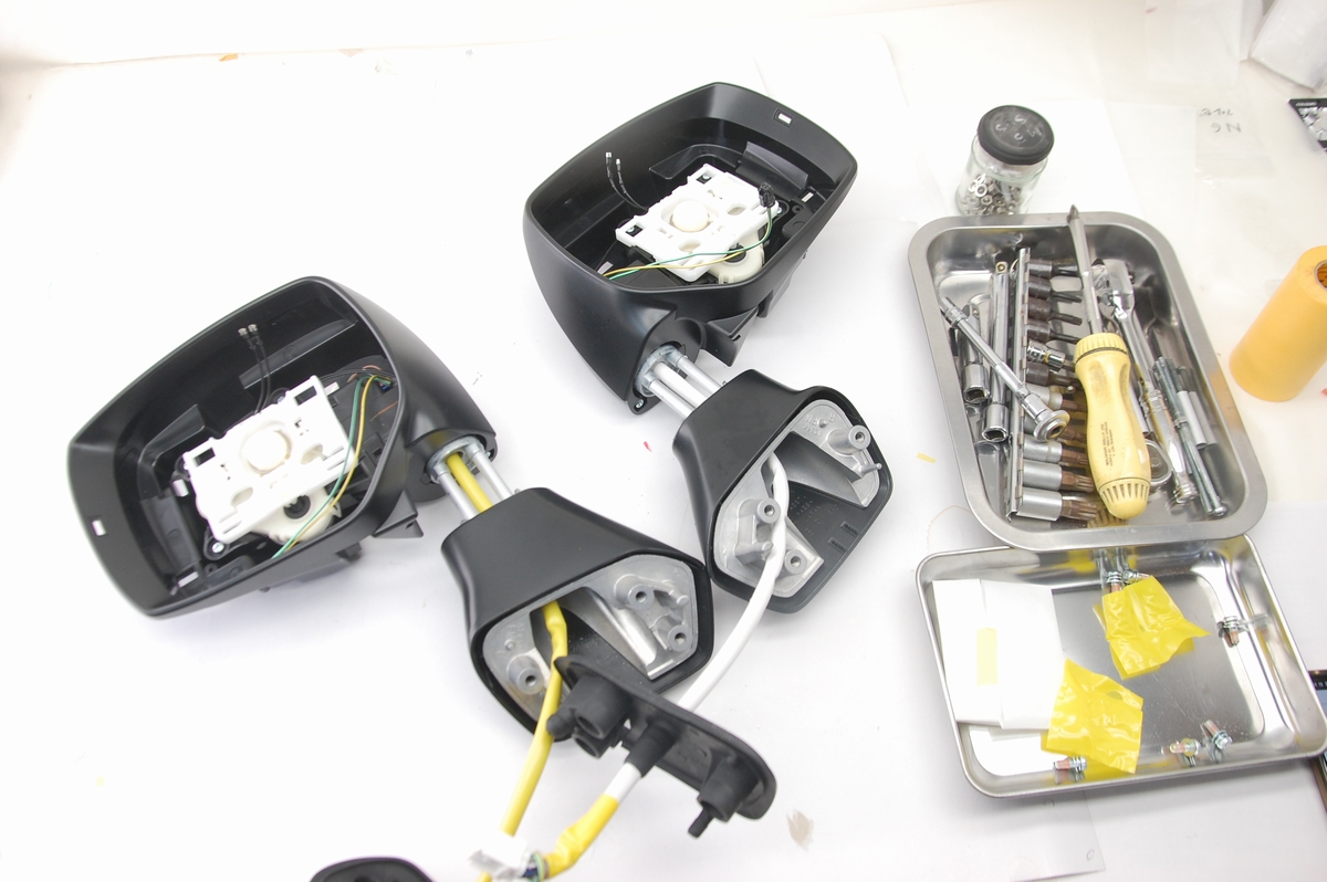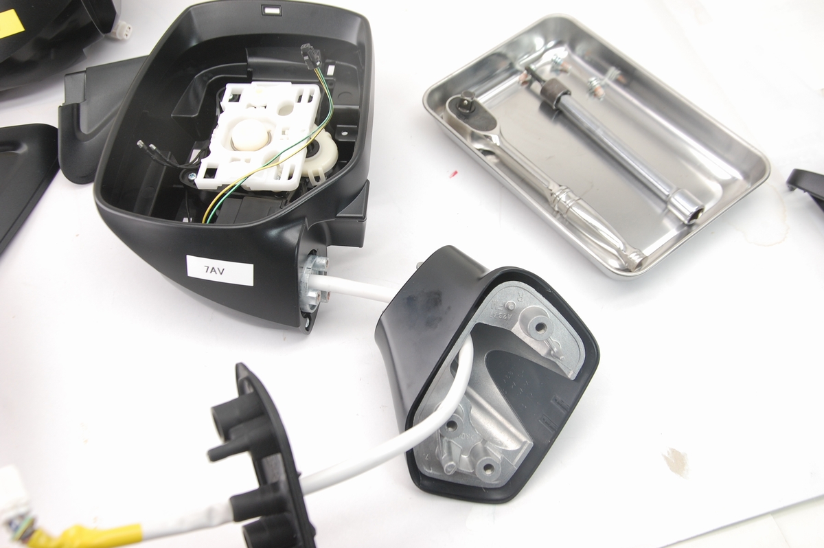 ただ完全に切り離すにはこのカプラーから各配線を引き抜く必要があり、それには専用の工具(または固い針状の物)を使うのですが、当店では車体取り付けでの稼働テストが出来ないので今回はこのまま行う事にします。ちなみに昔のポルシェなんかはこのコネクターを分解しないと車体からドアミラー自体を取り外せないので、そういったケースでは何度か経験はあります。