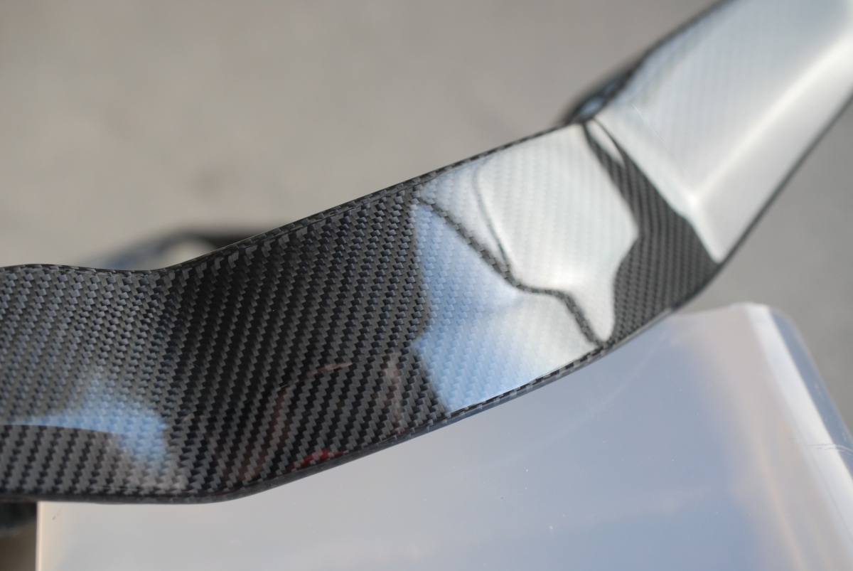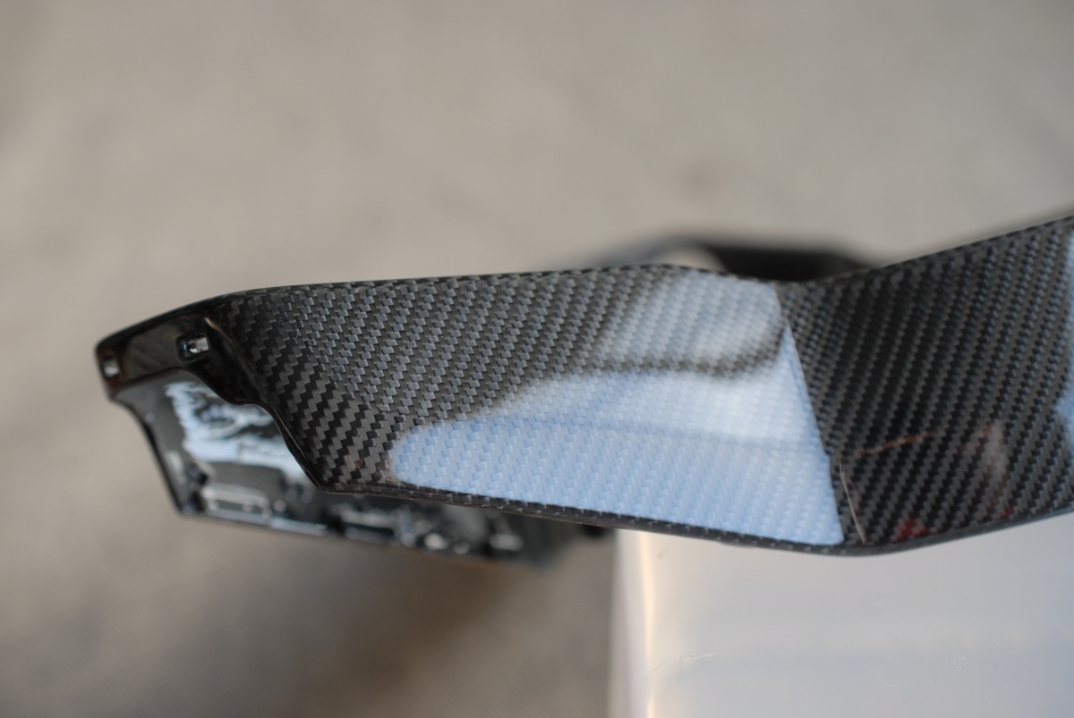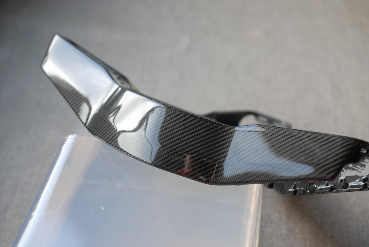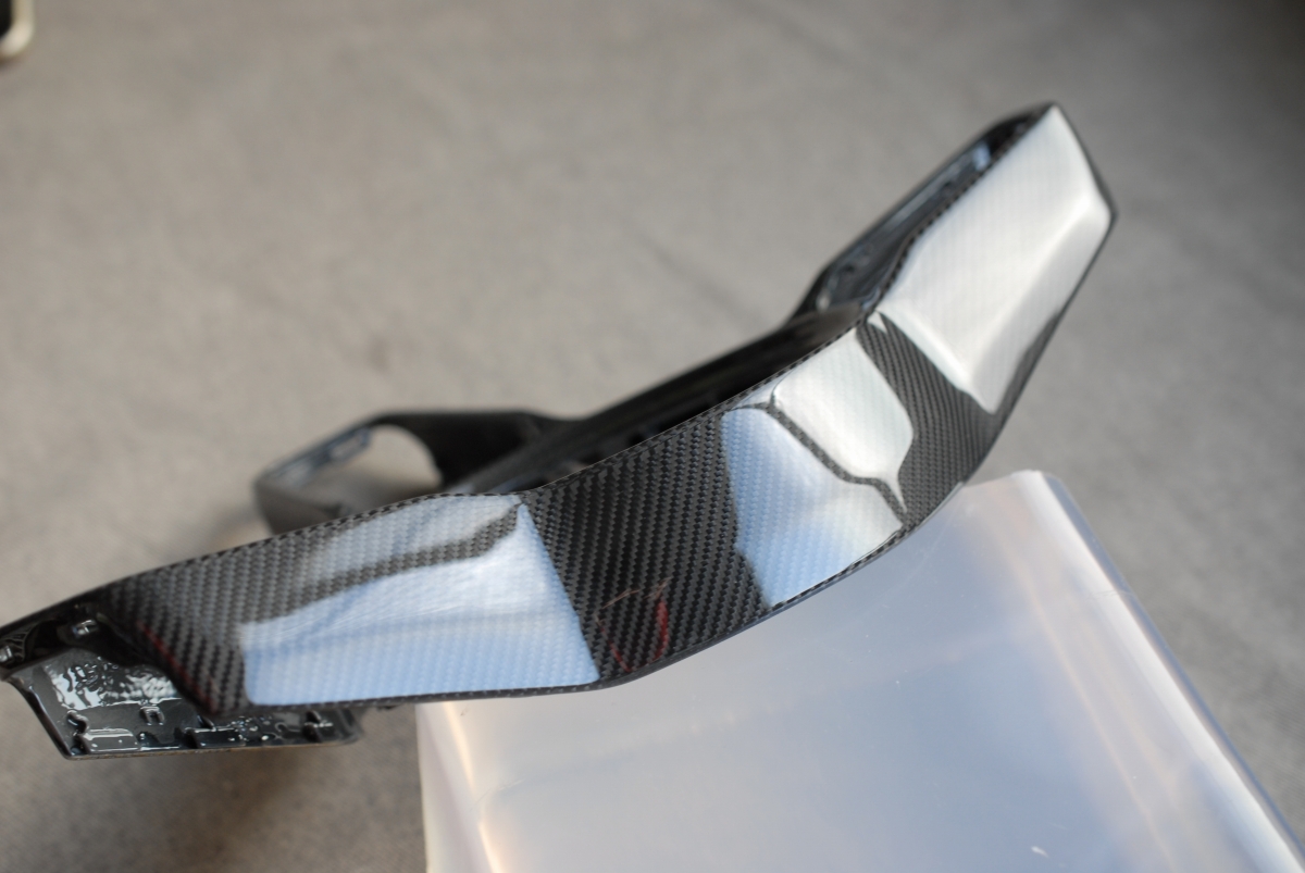 さらには一部のカーボンがベースとなるプラスチック素地から剥がれて浮いている!という事が発覚し、一旦作業を中止してカーボン施工専門業者さんに部品を送り、隙間から接着剤を浸透させて固定して貰う事としました。
