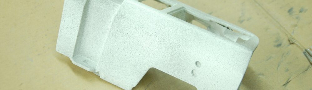 先日サーフェサーを塗っておいたホンダフィットの内装コンソールパネルです。その後60℃40分程の熱を掛けて塗膜を硬化させ、ガイドコートとしてベースコートの黒をパラパラと塗っておきました。