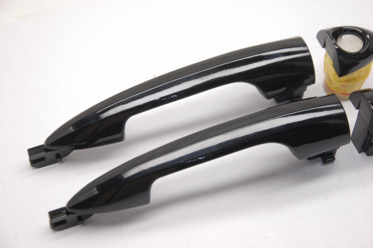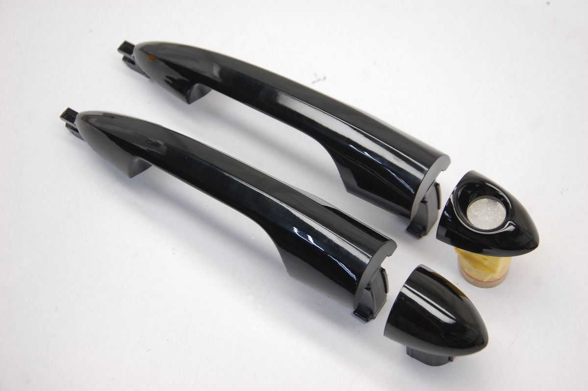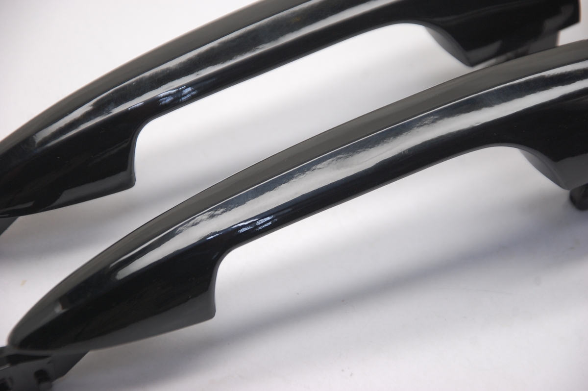 こちらはルノーのアウターハンドルで、元々ザラザラとした梨地だった物を、今回と同じく「研磨→プライマー塗布→サフェーサー塗布→完全硬化→研磨」といった下地処理を行ってからの上塗りで艶々の黒に仕上げています。