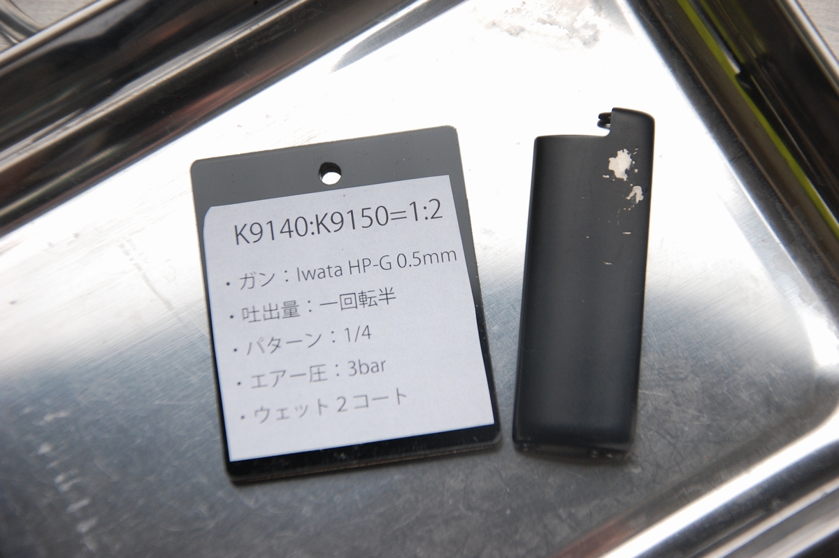 調色が終わったら今度は艶調整の作業となります。といってもこちらは塗りながら艶の具合を変えられる訳ではないので、予め艶具合が変わる配合にしたクリアーを用意し、それぞれを塗って確認する方法となります。本塗り同様の作業なので手間と時間も相応に掛かります。