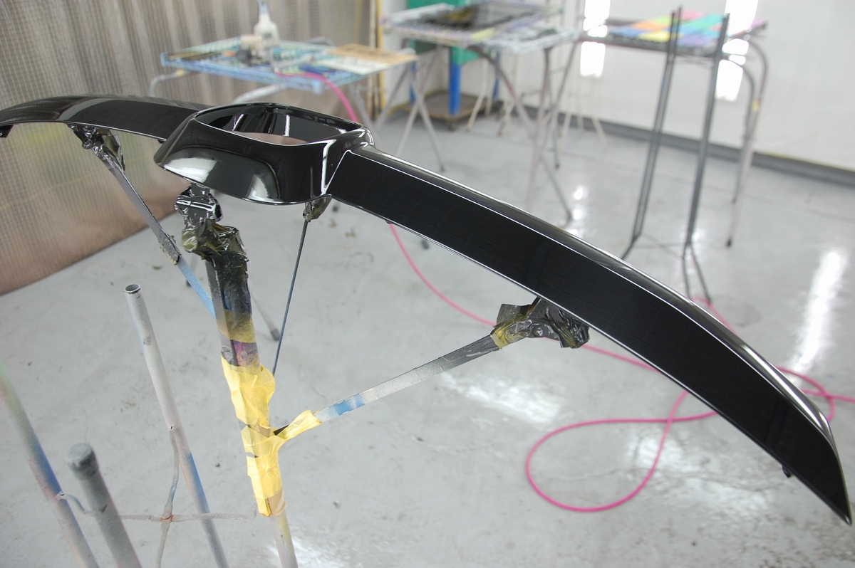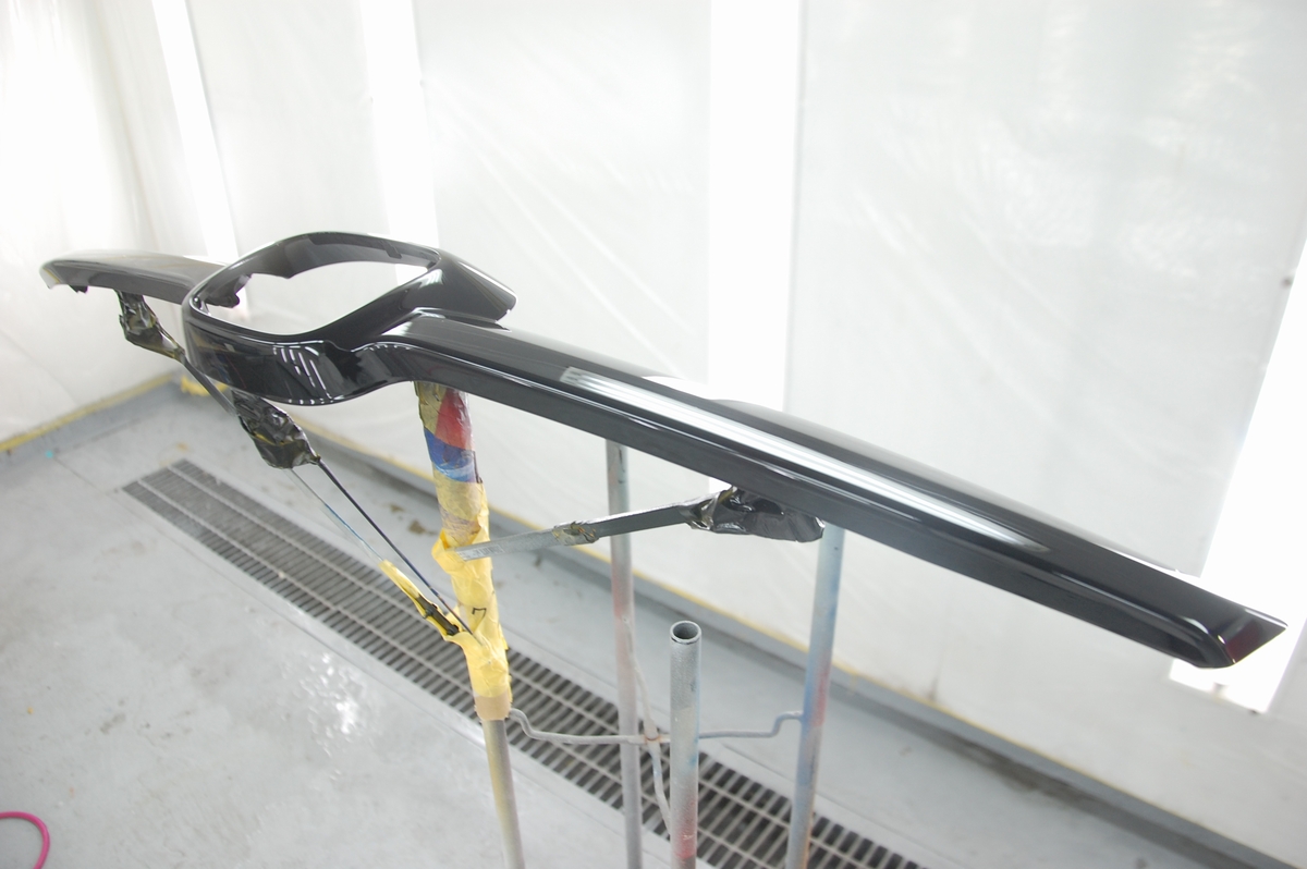 また艶のない状態のまま見ても色味は判りませんので、艶出し剤=当店の場合はスプレーガンにシリコンオフを入れてスプレーして確認するようにしています。市販の缶スプレータイプの艶出し剤(同じく揮発速度の遅いシリコンオフ)の方が便利なのですが、余り使う機会が無い当店だと中のガスだけ先に無くなってしまうので少々面倒ですがスプレーガンを使うようにしています。