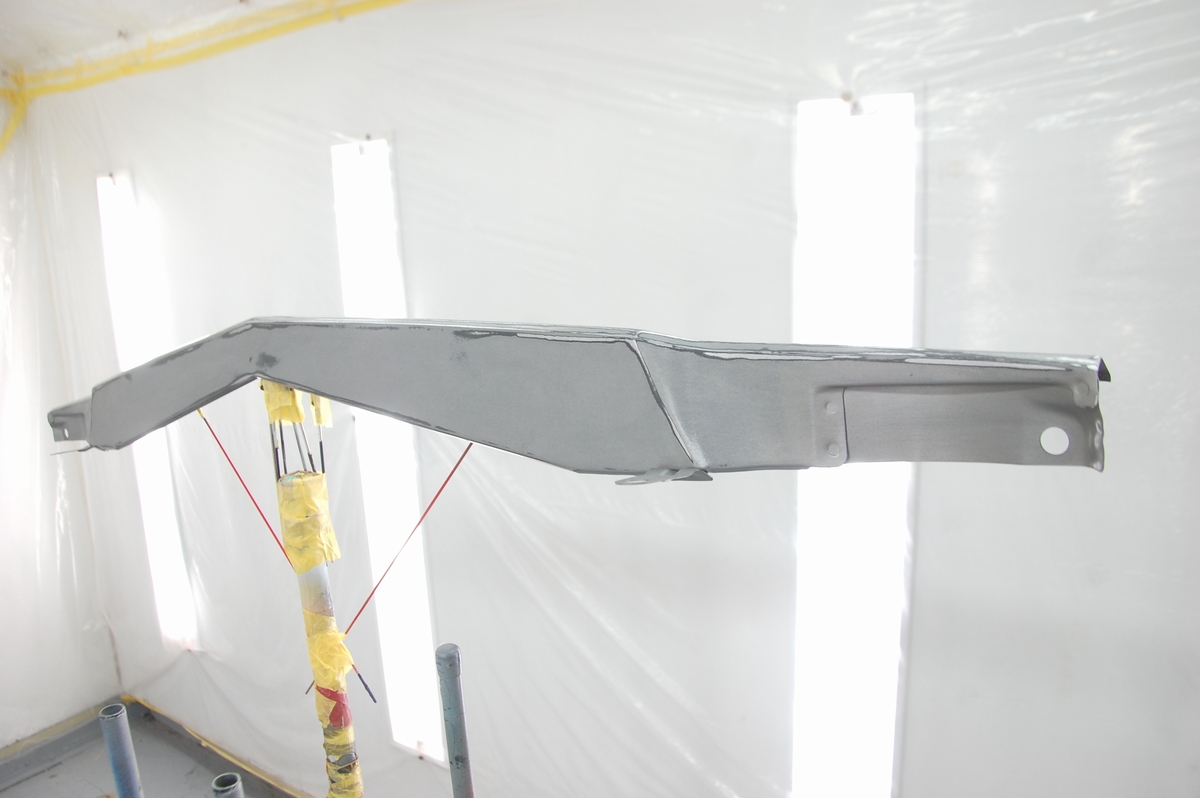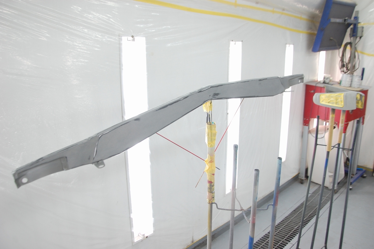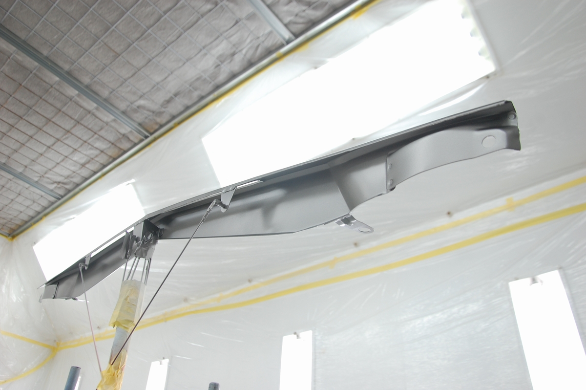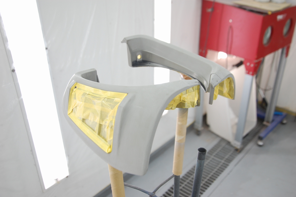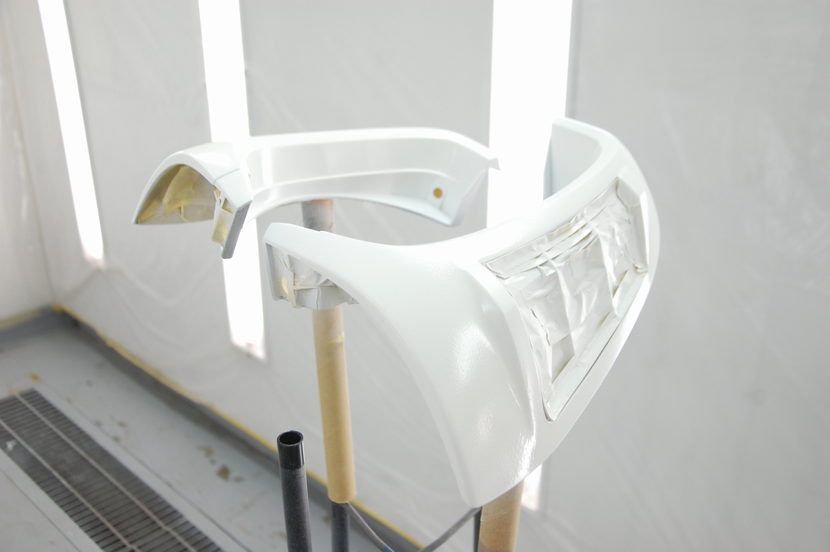 これは溶接が必要なコアサポート等の交換時に行うのと同じ方法で、ただ私がディーラーの内製工場に勤めていた頃はここまではしていませんでした。元々塗ってある黒いプライマーに直接ベースコート&クリアーを塗っていて、ここまでやると普通は赤字=採算がとれませんから、会社としては許されない行為だったりします(それでもレーバーレートの高い外車が対象だったので良い方だったと思います)。