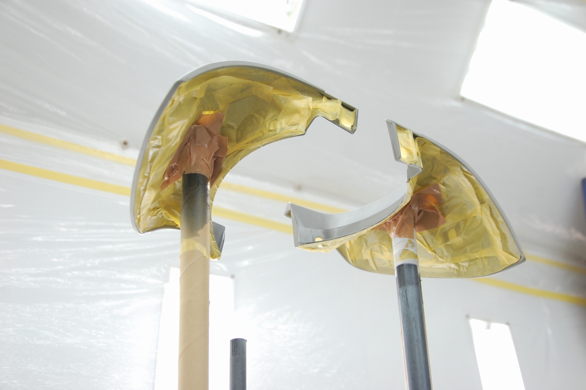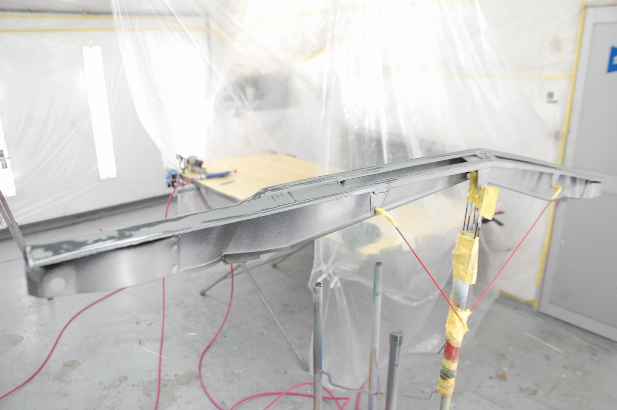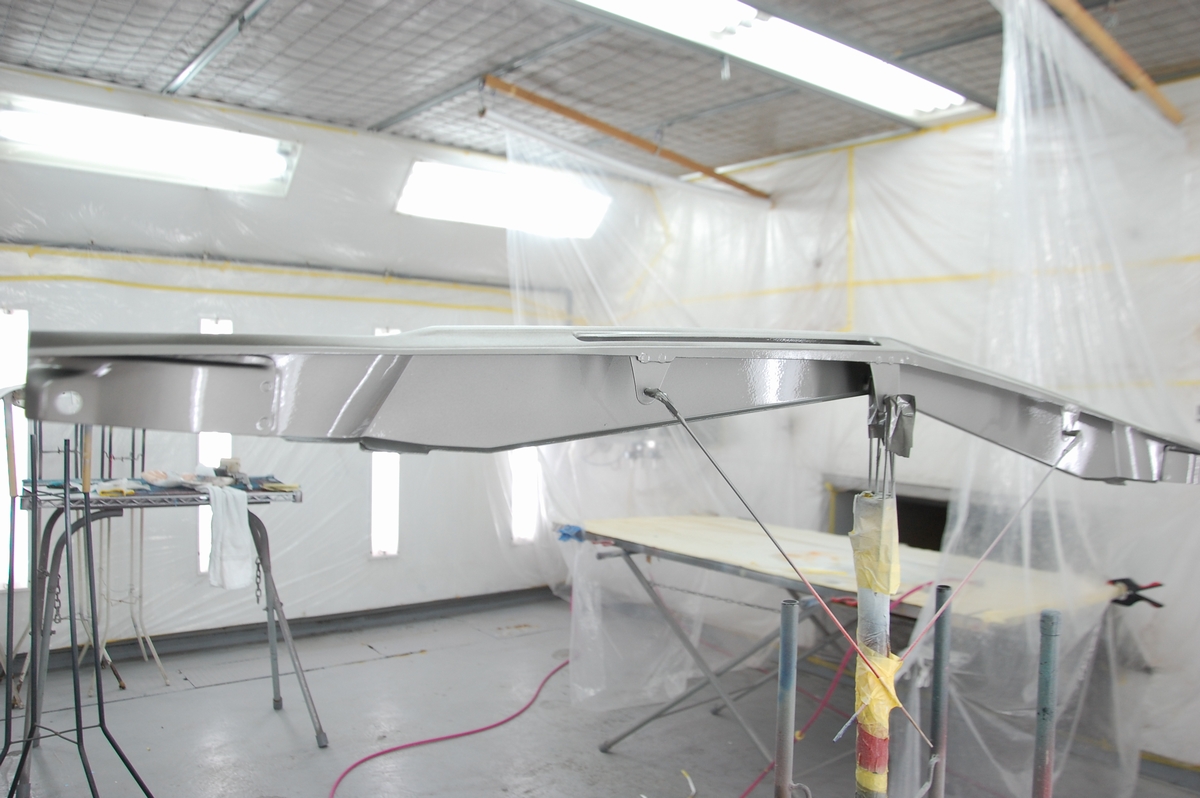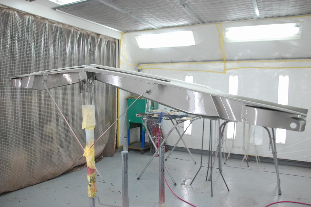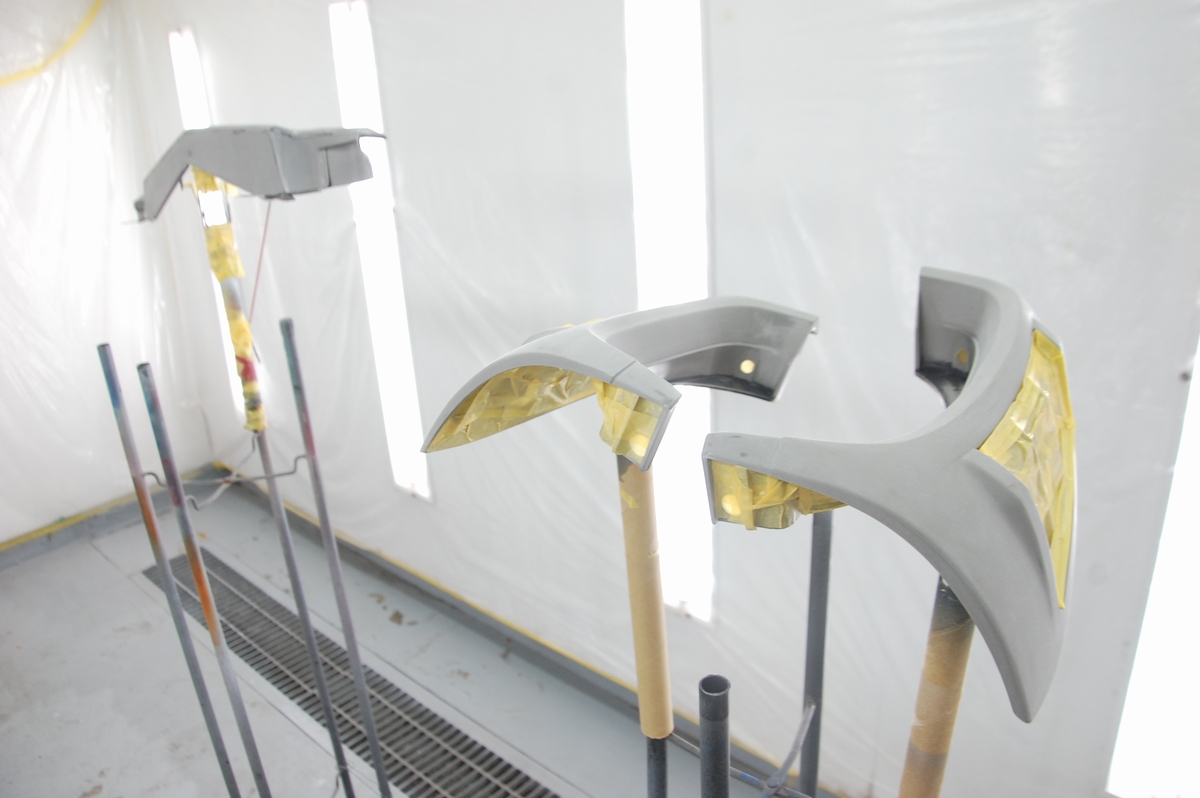 これは溶接が必要なコアサポート等の交換時に行うのと同じ方法で、ただ私がディーラーの内製工場に勤めていた頃はここまではしていませんでした。元々塗ってある黒いプライマーに直接ベースコート&クリアーを塗っていて、ここまでやると普通は赤字=採算がとれませんから、会社としては許されない行為だったりします(それでもレーバーレートの高い外車が対象だったので良い方だったと思います)。