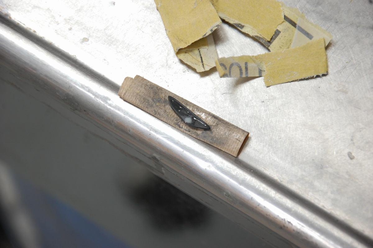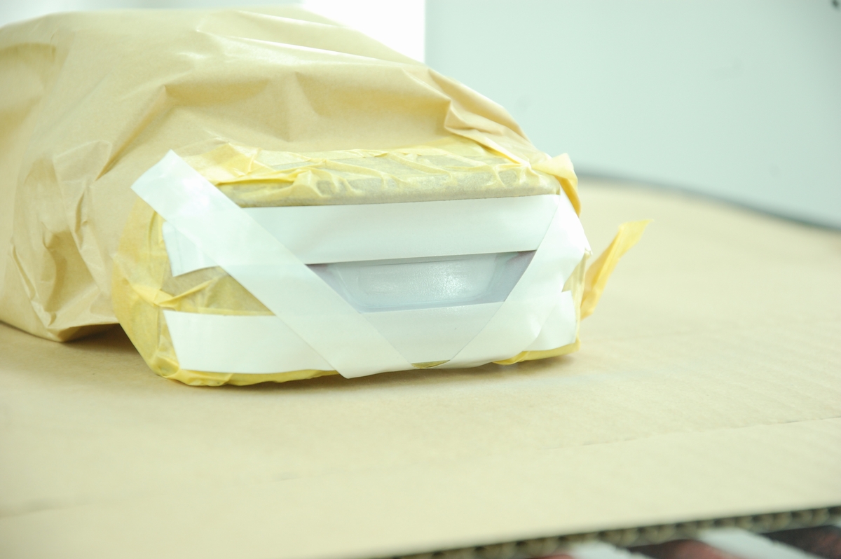 その後適当な木片に両面テープを貼り、外した注型レンズを仮止めしてペーパー掛けをして形を整えます。一回り小さく&角を取るような感じですね。