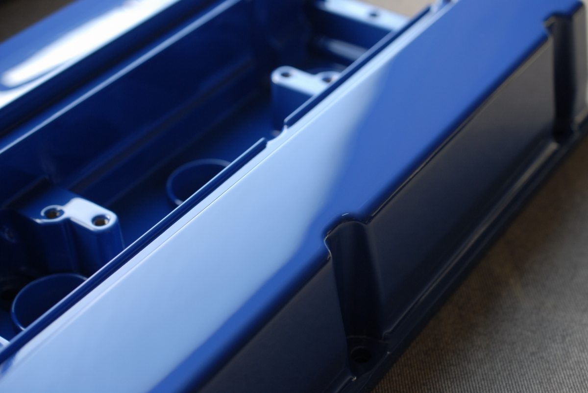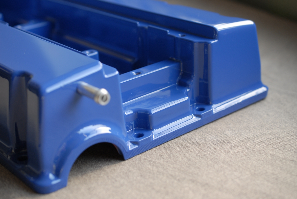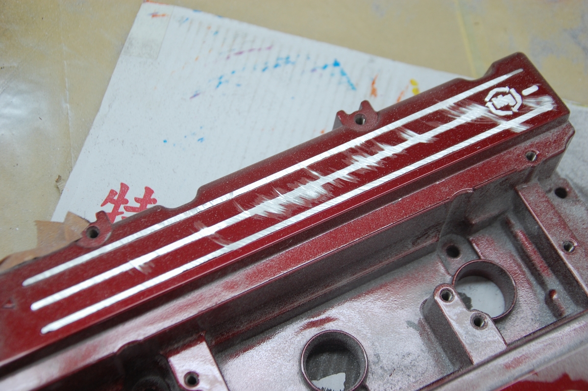 この時のヤマハV-MAXのヘッドカバーのように、ボルトで止める箇所はプライマーとベースコートの黒を塗ってマスキング→結晶塗装としています。