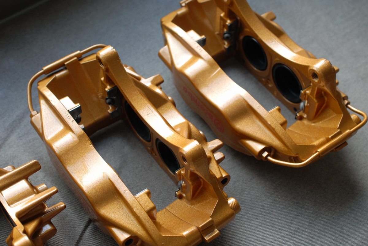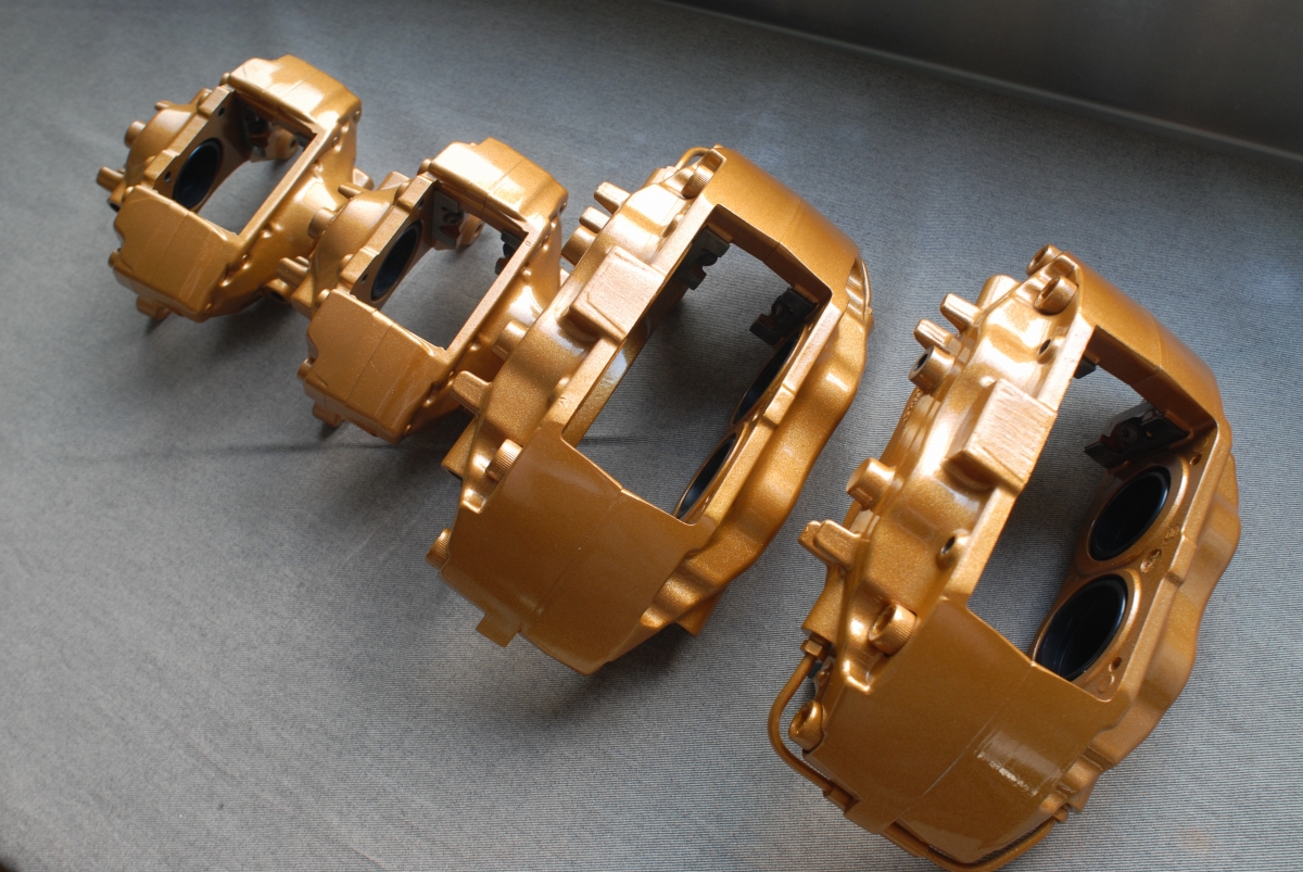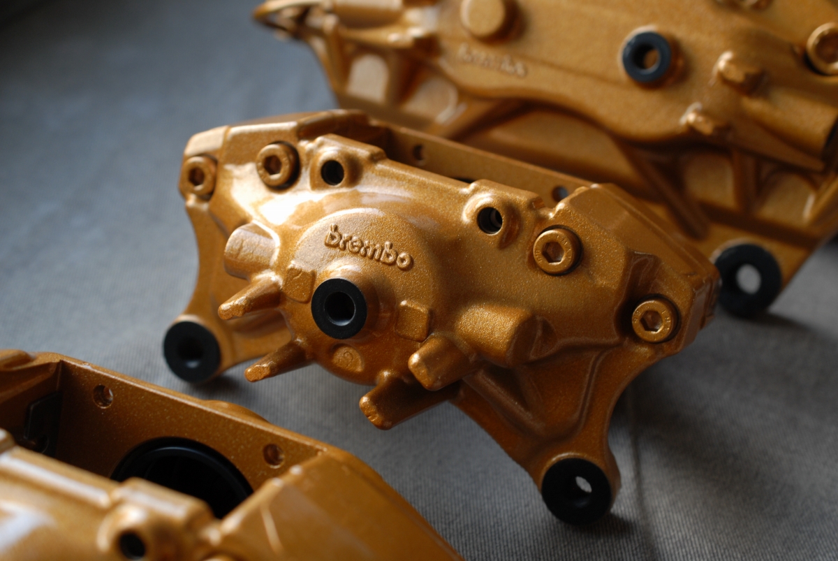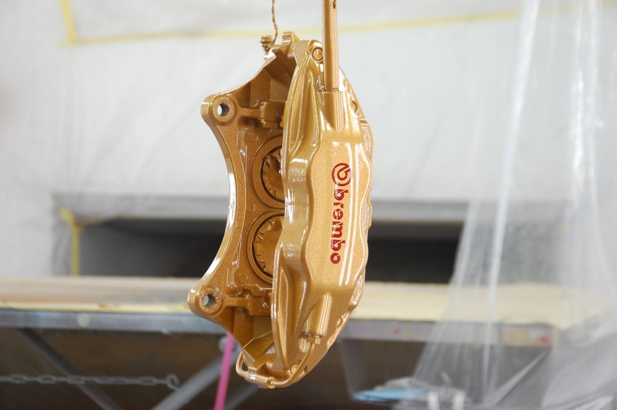 ただブレンボキャリパーの場合、元々塗られている塗装(新品時の塗装)に問題があって、よく見受けられるのがベースカラー(今回の場合だとゴールド色)とトップコート(クリアー)との密着性が低く起こる層間剥離で、この場合一部で剥離が起きているだけでも「全て剥がれる可能性がある」という事になるので、こういった場合では全部剥がしてから塗り直す必要があります。キャリパー以外の新車時塗膜では、トヨタのホワイトパールクリスタルシャイン(カラーコード:070)などは新車時から下地と上塗りとの間で密着性が低く、経年でペリペリと剥がれたりするのは有名な話ですよね。なのでブレンボキャリパーの場合はほぼ100%剥離を行ってから塗装を行うようにしています。