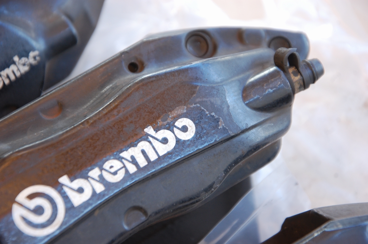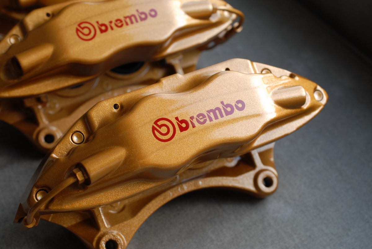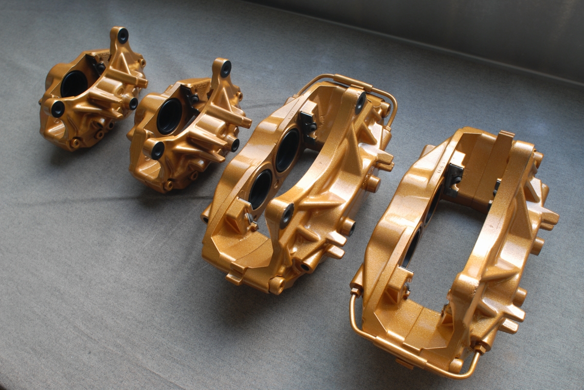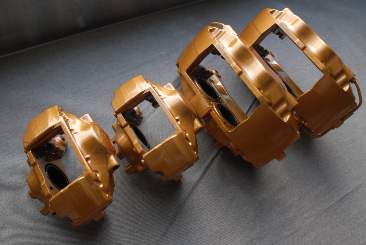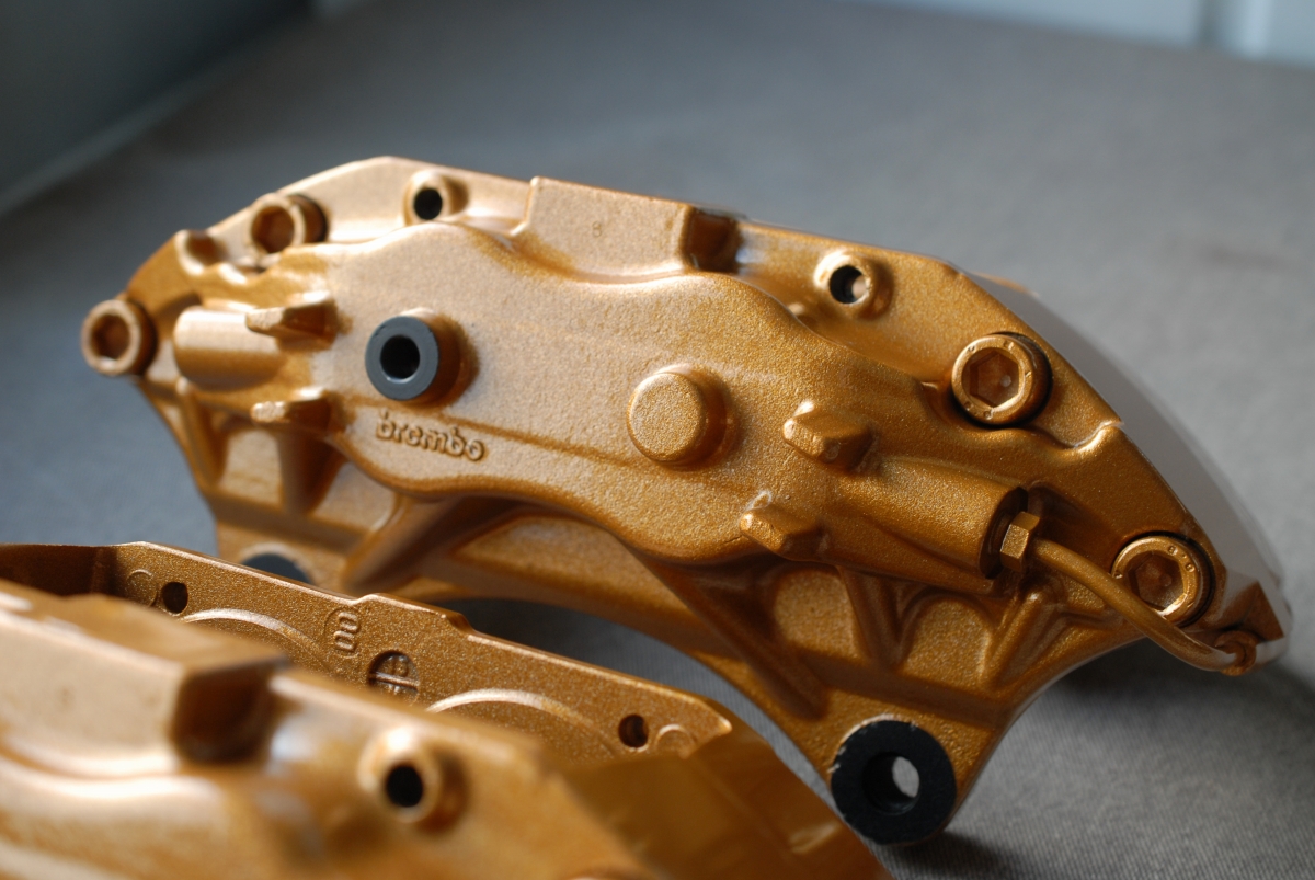 ただブレンボキャリパーの場合、元々塗られている塗装(新品時の塗装)に問題があって、よく見受けられるのがベースカラー(今回の場合だとゴールド色)とトップコート(クリアー)との密着性が低く起こる層間剥離で、この場合一部で剥離が起きているだけでも「全て剥がれる可能性がある」という事になるので、こういった場合では全部剥がしてから塗り直す必要があります。キャリパー以外の新車時塗膜では、トヨタのホワイトパールクリスタルシャイン(カラーコード:070)などは新車時から下地と上塗りとの間で密着性が低く、経年でペリペリと剥がれたりするのは有名な話ですよね。なのでブレンボキャリパーの場合はほぼ100%剥離を行ってから塗装を行うようにしています。