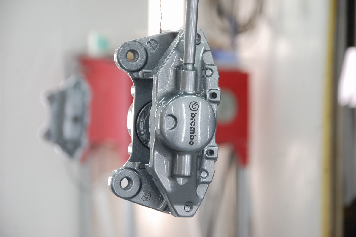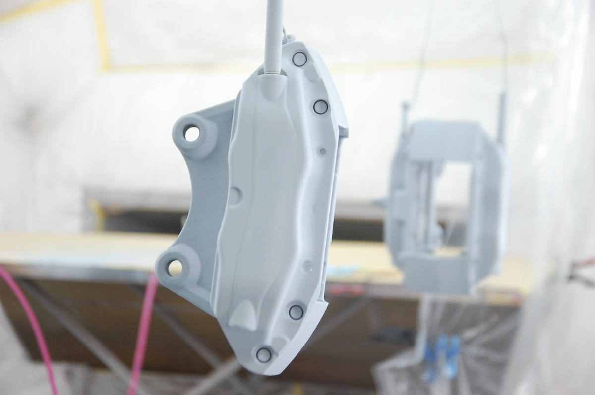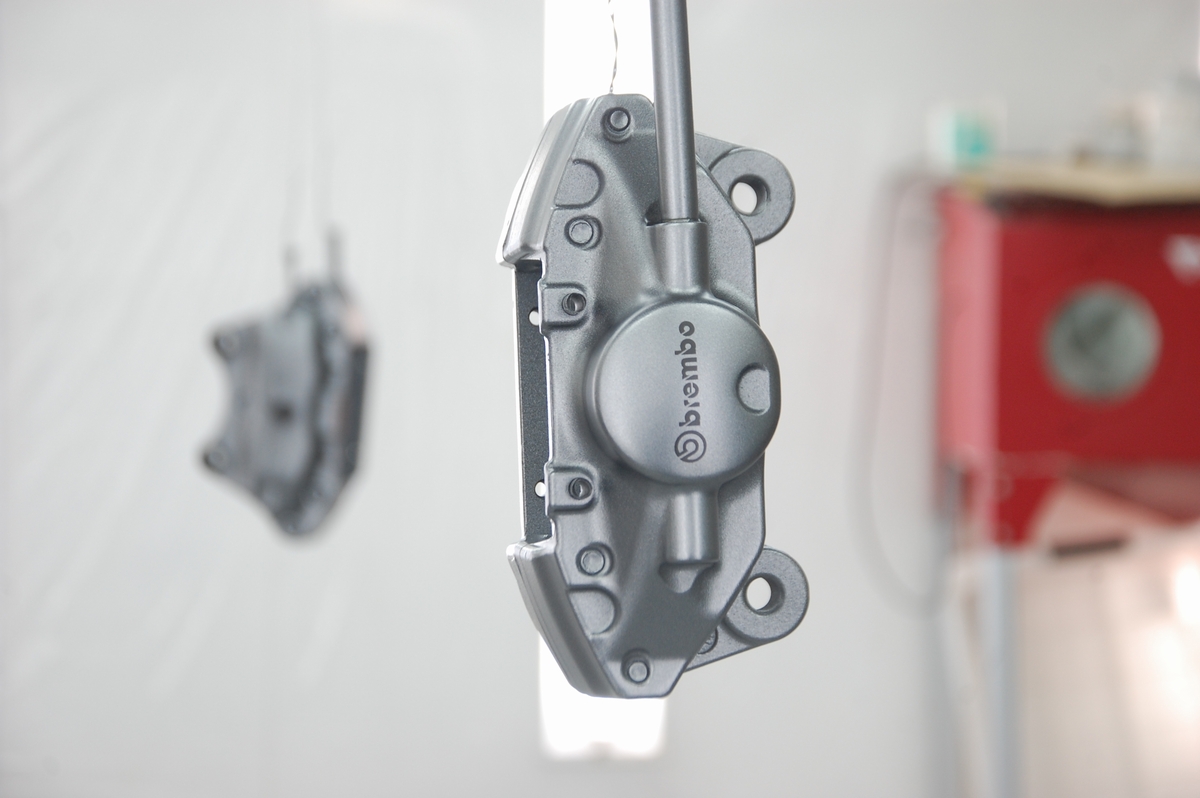 ボルト&ステー取り付け部やガスケット当たり面、パッド固定ピンを通す穴の内側は塗膜の厚みをつけないようプライマー&ベースコートの黒のみを薄膜で塗装しています。