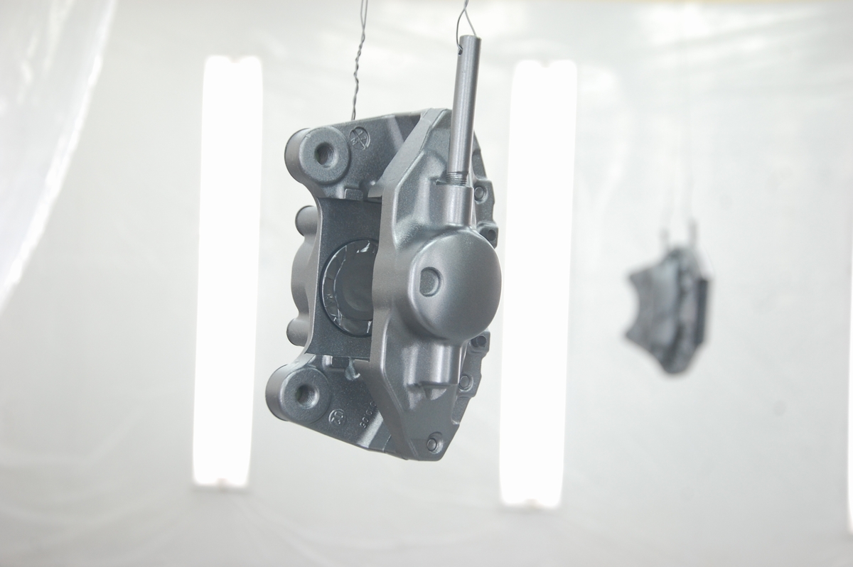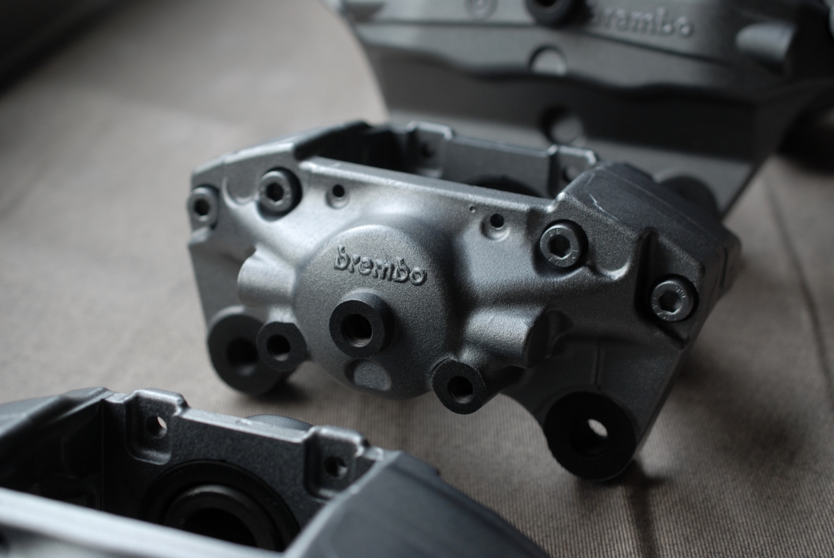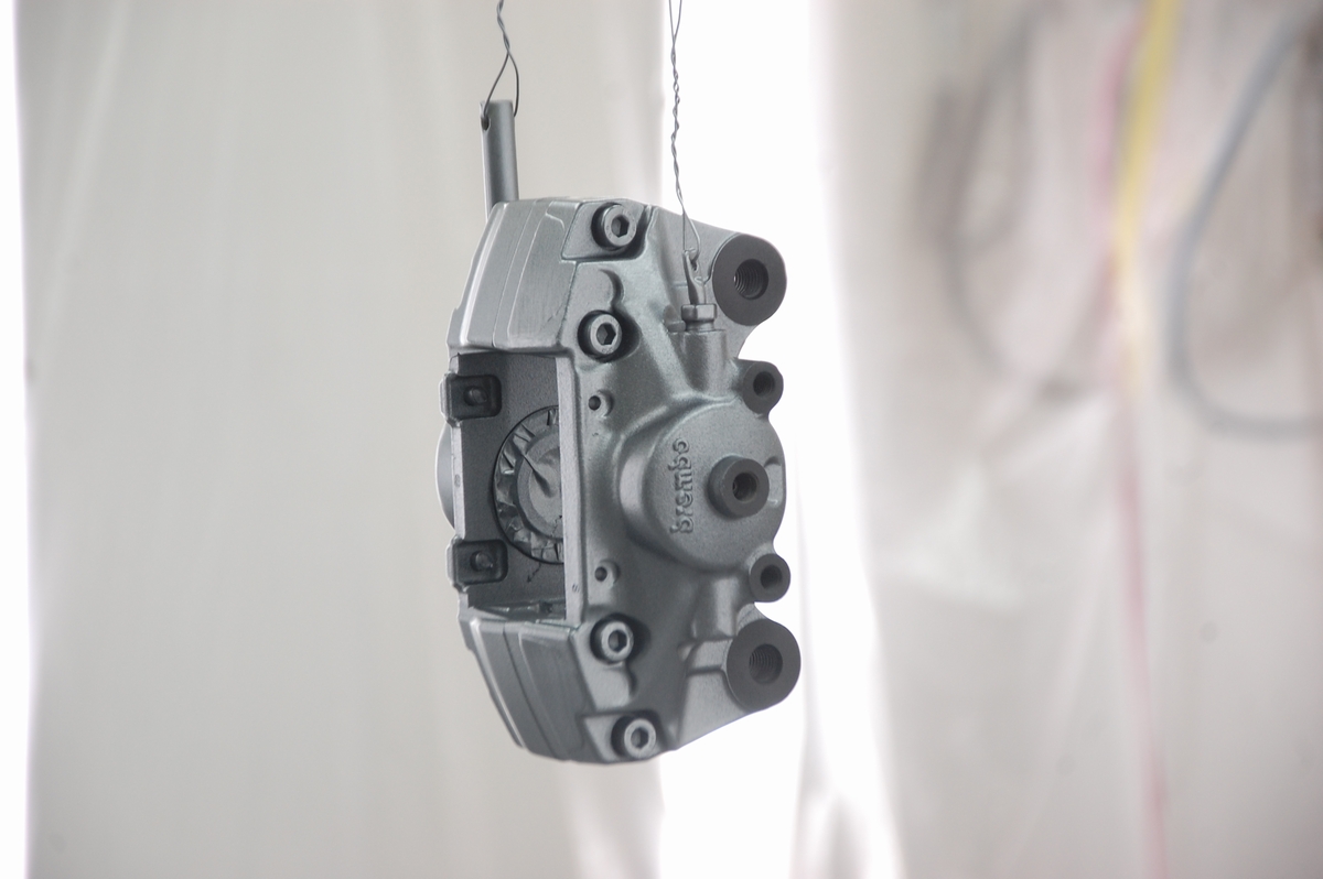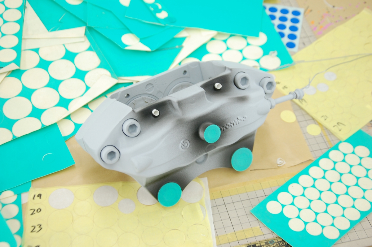 ボルト&ステー取り付け部やガスケット当たり面、パッド固定ピンを通す穴の内側は塗膜の厚みをつけないようプライマー&ベースコートの黒のみを薄膜で塗装しています。