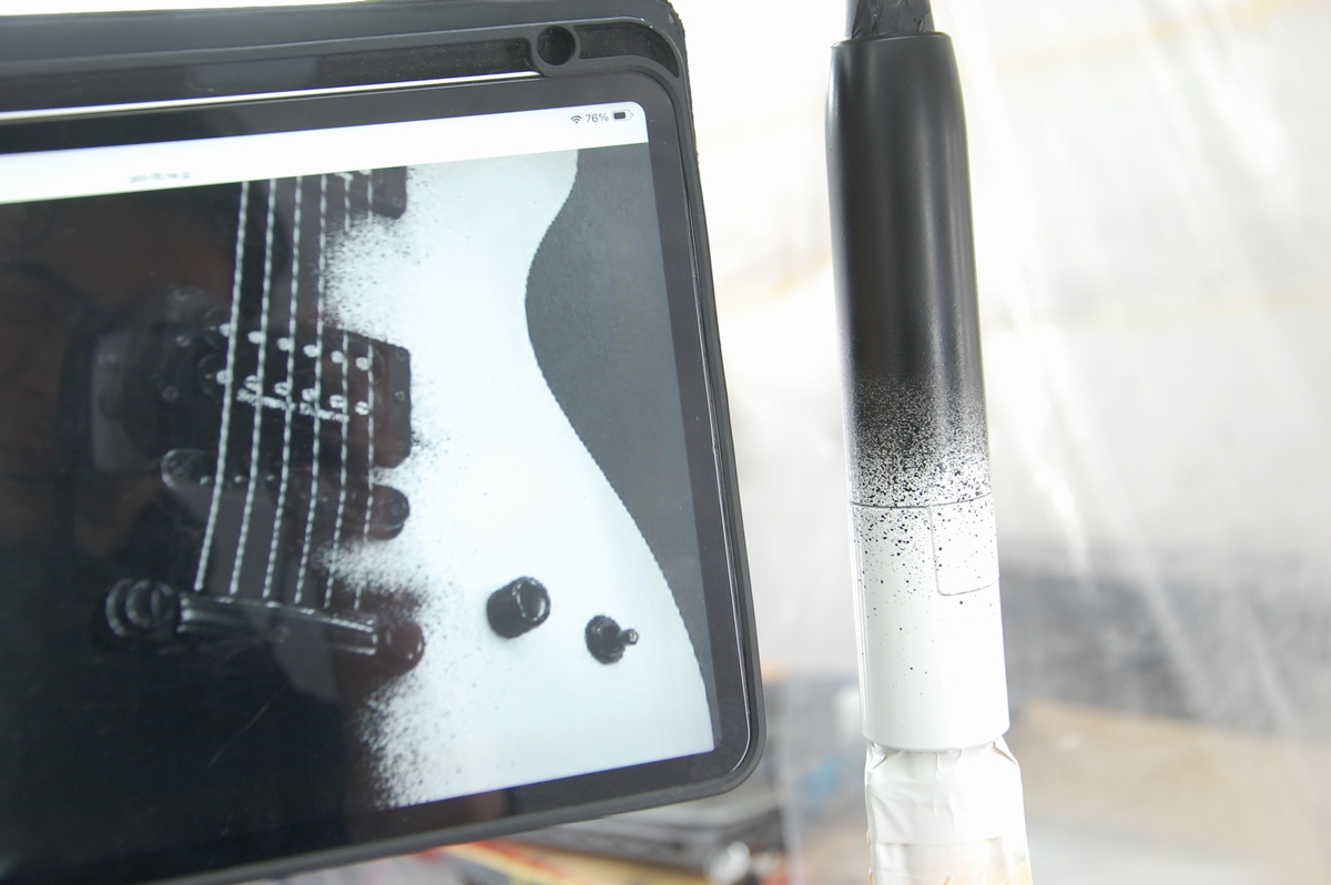 スプレー方法としては大理石調塗装のような感じで、エアー圧をかなり絞ってガンの吐出口に塗料を溜めて飛ばす、みたいな感じです。その都度トリガーを握っては離してを繰り返すので狙った位置がズレやすく、なのでガンの方では無くマイク本体をクルクル回して塗っています。