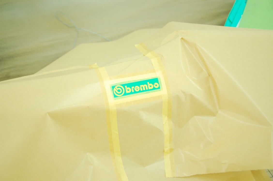 ベースカラーのイエローが十分に乾いたら、元のサイズ(幅68mm)と同じbremboのロゴ入れを行います。