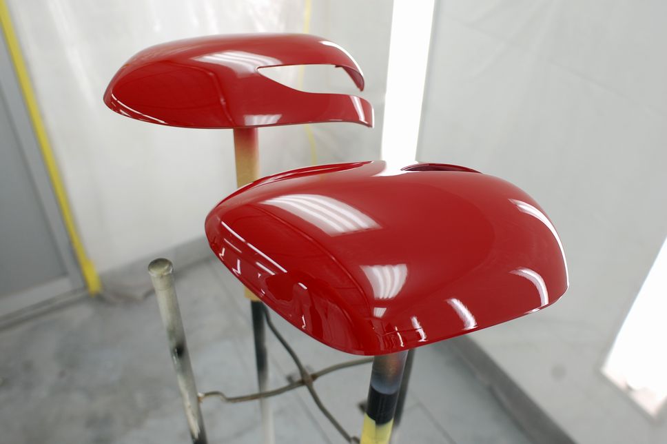 こちらもお待たせしました!ホイールの赤と同色にとご依頼頂いていましたインプレッサのミラーカバーです。現状はホワイトパールに塗られている製品で、特に傷などは無いので下地処理は足付け処理のみとなります。ちなみに素材はプラスチックですが、既に塗装がしてあってプラスチック素地が露出している箇所はありませんからこういった場合にはプラスチック用プライマーの塗布は必要ありません。プラスチックは素材によっては塗料の密着性が悪い物があって(ポリプロピレンなど)、その場合にのみプライマーが必要なのです。