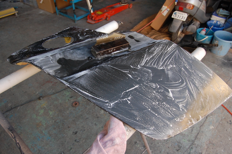 私の場合も普通であればまずベースクリアーを1コートないし2コートは塗っておいて上記のトラブル(と言うかミス)を防止するのが基本ですが、このカーボンパネルの状態でそれを行うと「エッジマッピング」(チヂレの一種)を起こしてしまいます。塗膜が切れている(エッジが露出している)のでこれは当然ですよね。