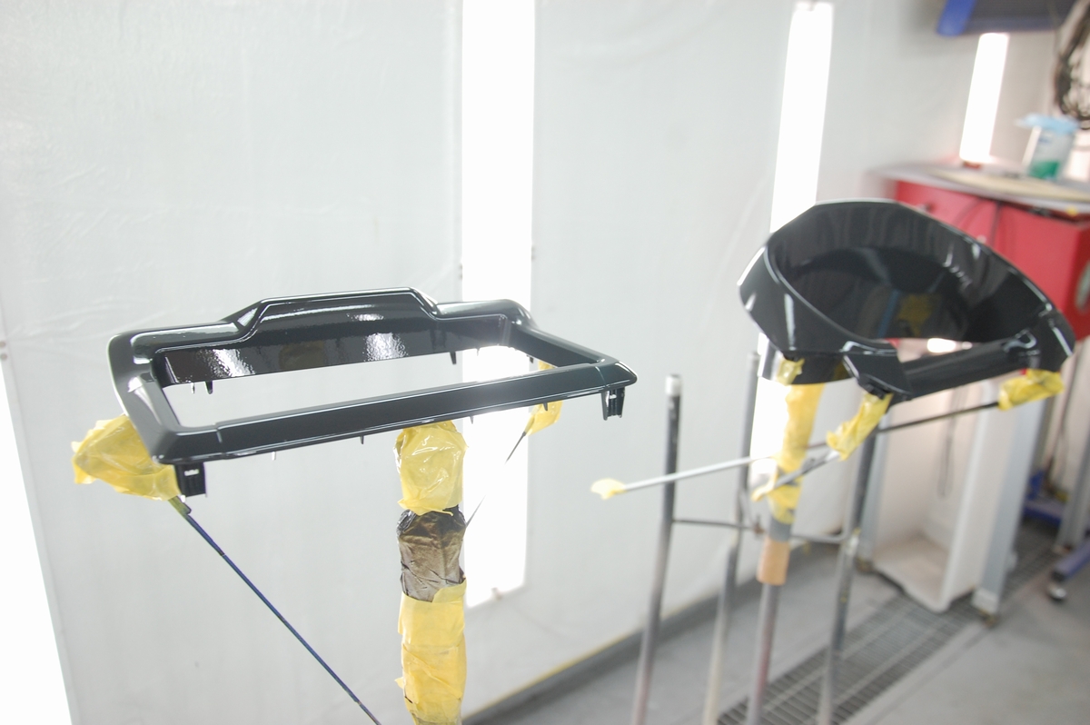 先日クリアーで下塗りを行っていたコペン内装パーツ8点中の2部品です。その後60℃40分程の熱を掛けて塗膜を硬化させておきました。