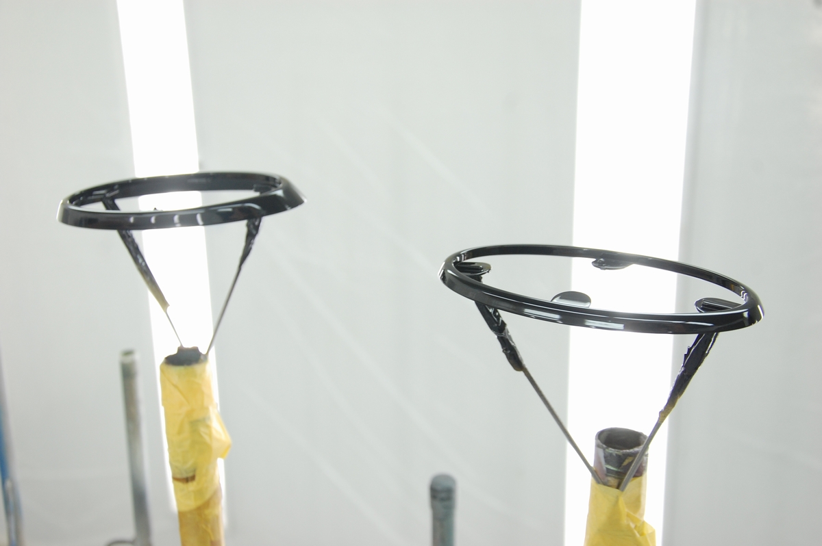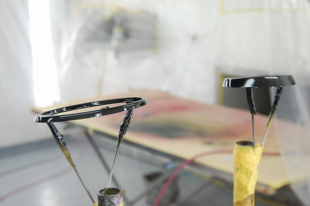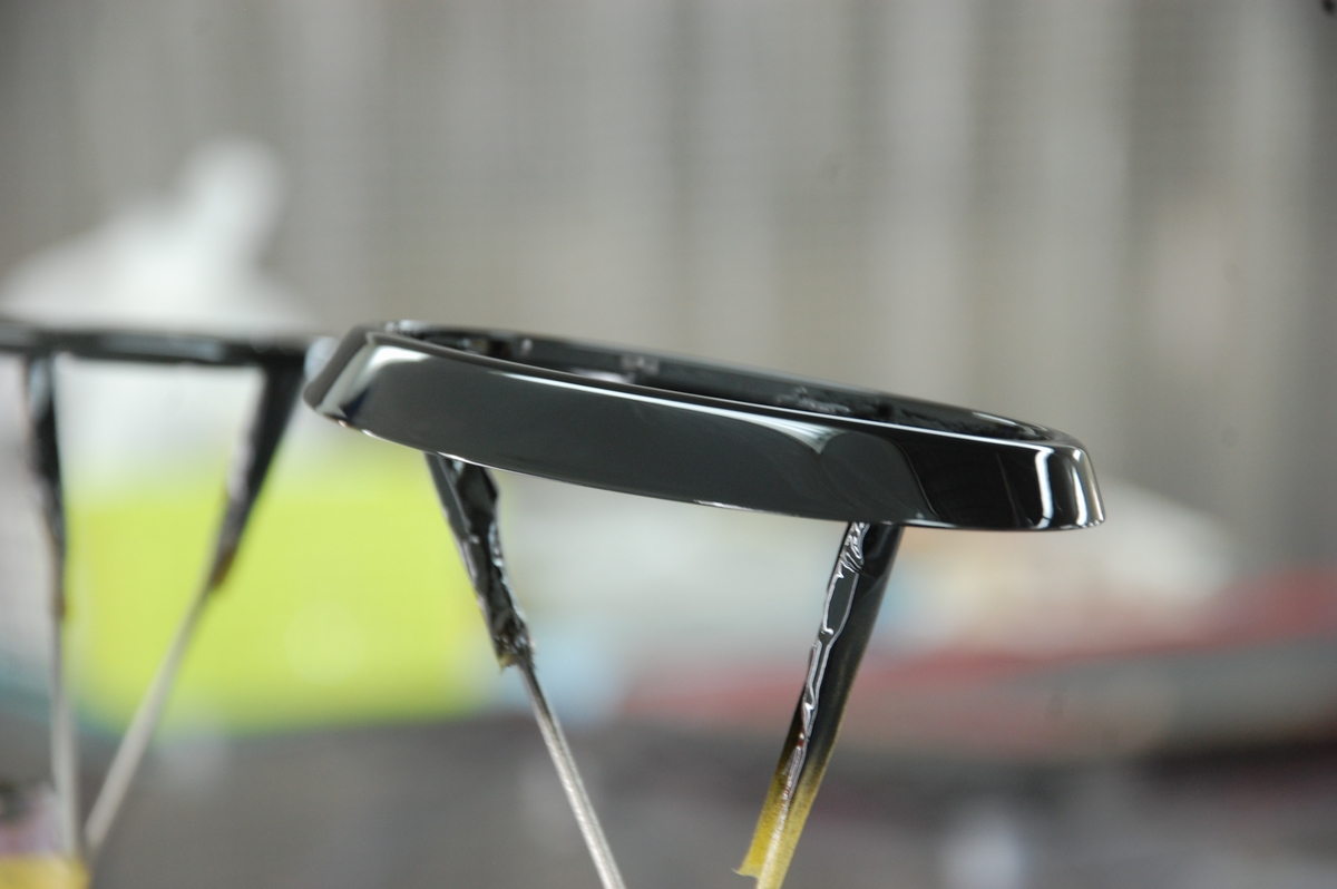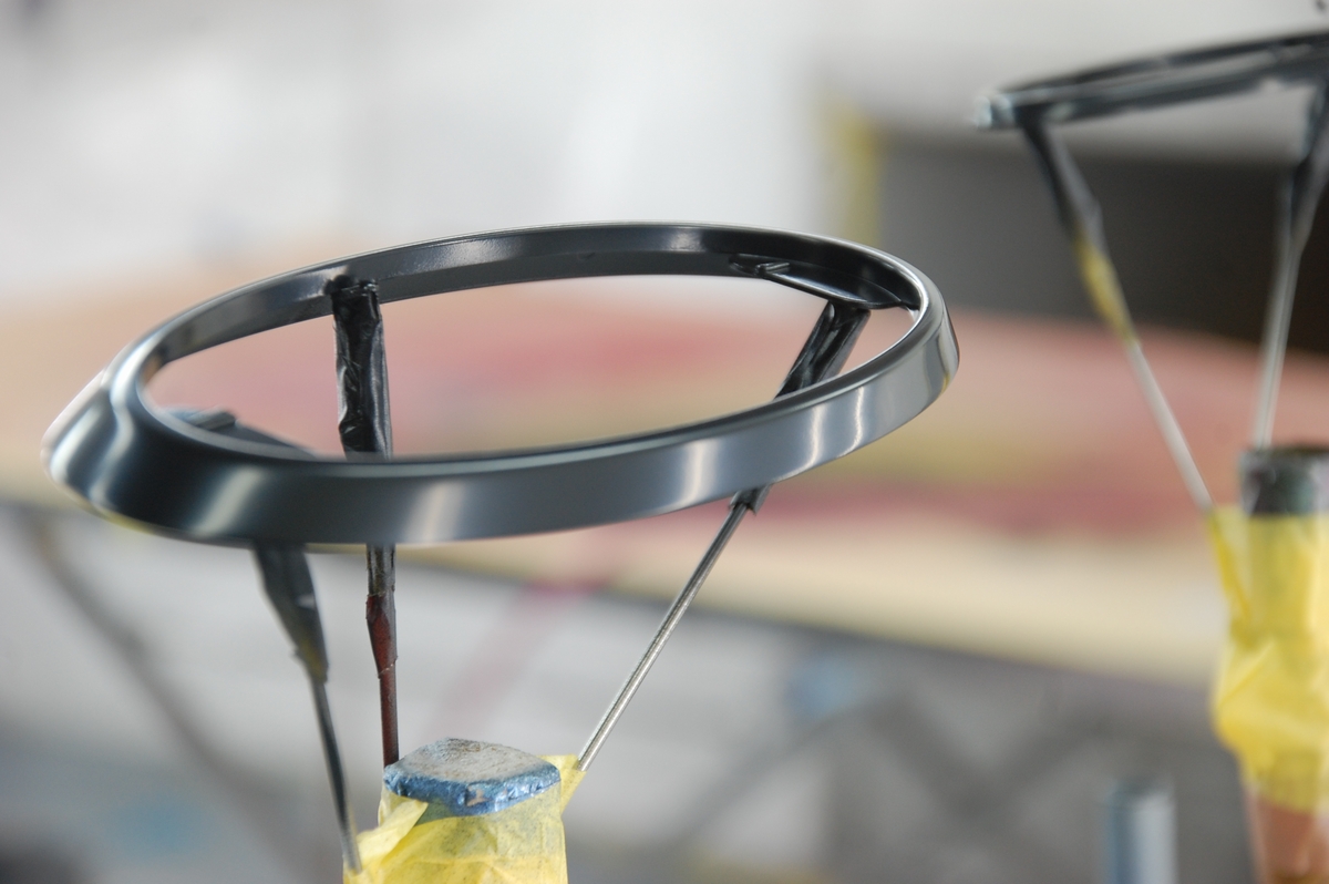 アクリルプレート塗装の順番としては、「裏側研磨→裏側クリアー塗装→表側クリアー塗装→裏側上塗り→表側上塗り」となっています。表裏を同時に塗れないので計4工程(4コート4ベイク)、これにメッキ枠の塗装2工程(下塗り→上塗り)が含まれ、計6回分の塗装工程となっています。